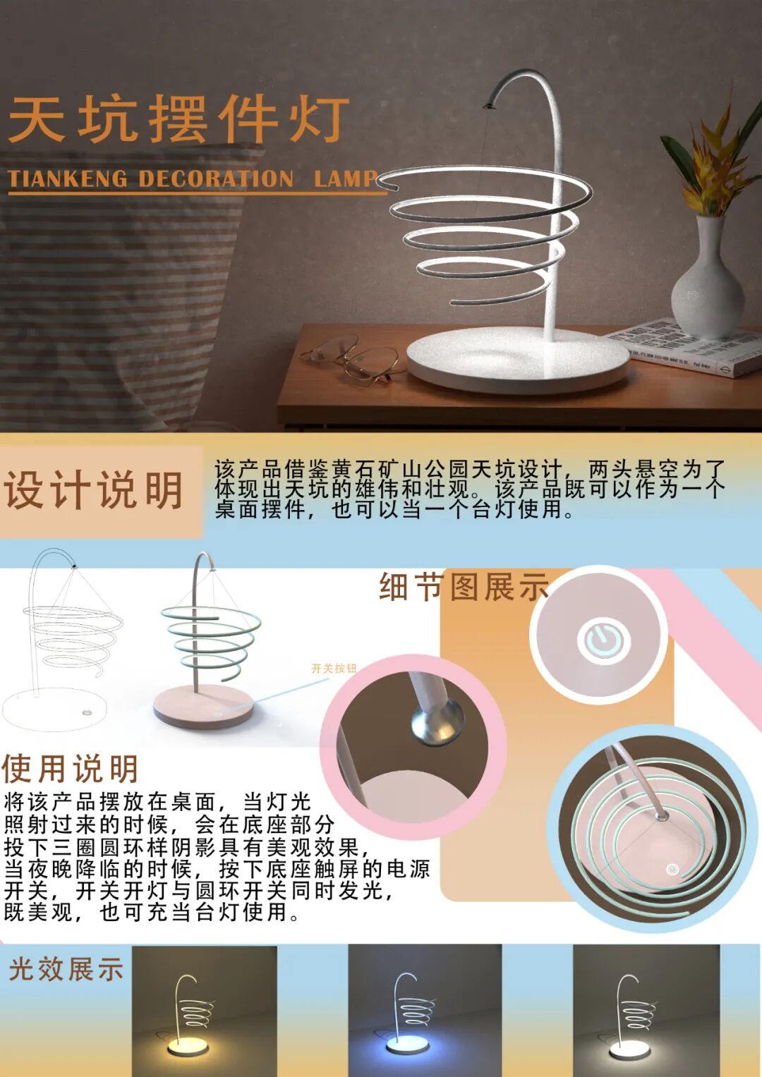 作品说明:该产品以黄石矿山公园中的天坑为设计基础和根本,主要为了展现天坑的雄伟和壮观,体现黄石本地的特点和文化风貌。将该产品摆放在桌面,当灯光照射过来的时候,会在底座部分投下三圈圆环样阴影具有美观效果,当夜晚降临的时候,按下底座长方体的电源开关,圆环即可发光,充当台灯使用。该产品底座材料为金属,熟料和磨砂材质组成。底座和支架为金属,按钮为塑料,圆环为塑料磨砂材质。
