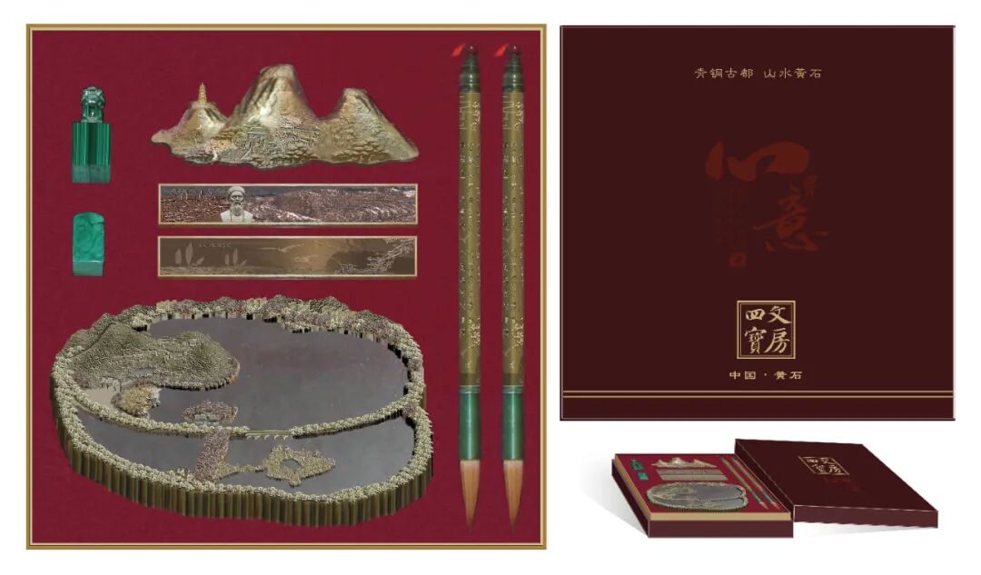 作品说明:《心意-文房四宝》是一套反映黄石文化特色的青铜制品,主要有:砚台、毛笔、镇尺、笔架+印章(孔雀石),是一套精美具有地方文化特色礼盒。砚台是鸟瞰磁湖,毛笔是张志和的诗,镇尺四面分别为:铜绿山古矿遗址、天坑、西塞山、仙岛湖,笔架是呈现东方山——东方佛国家之意境。