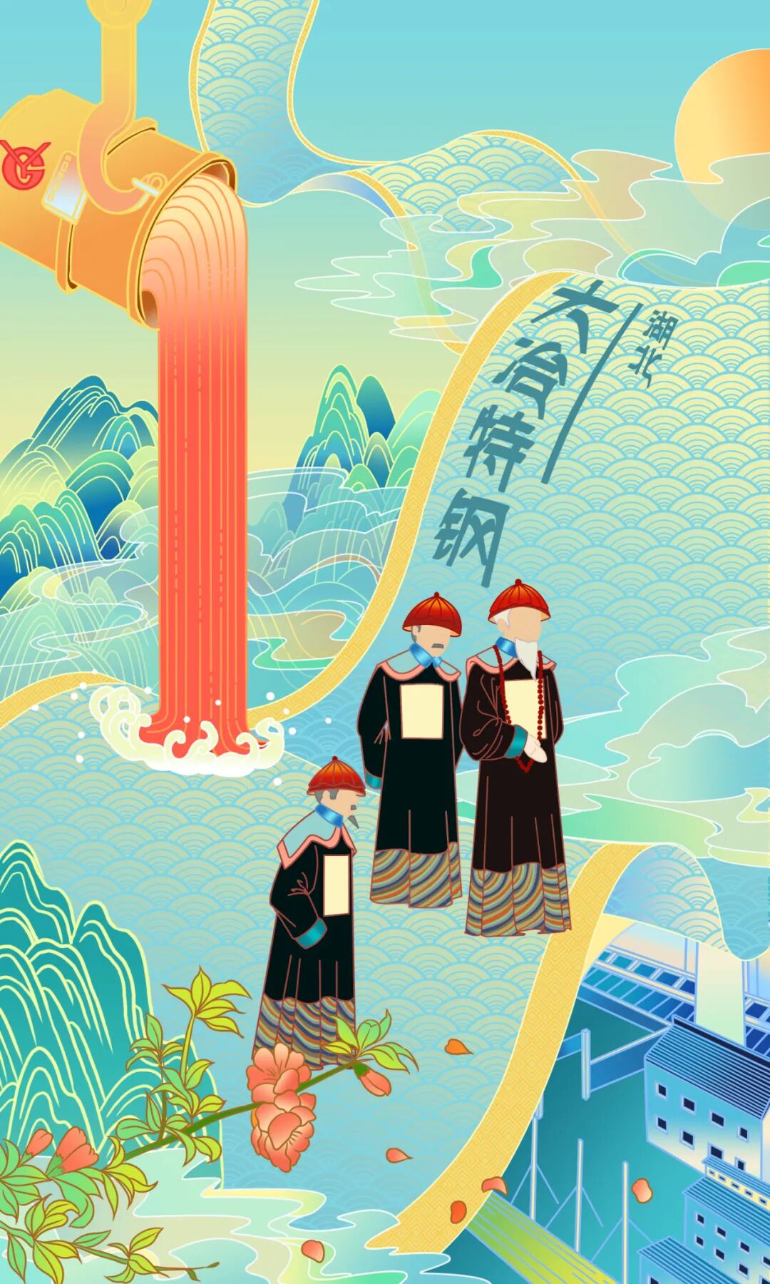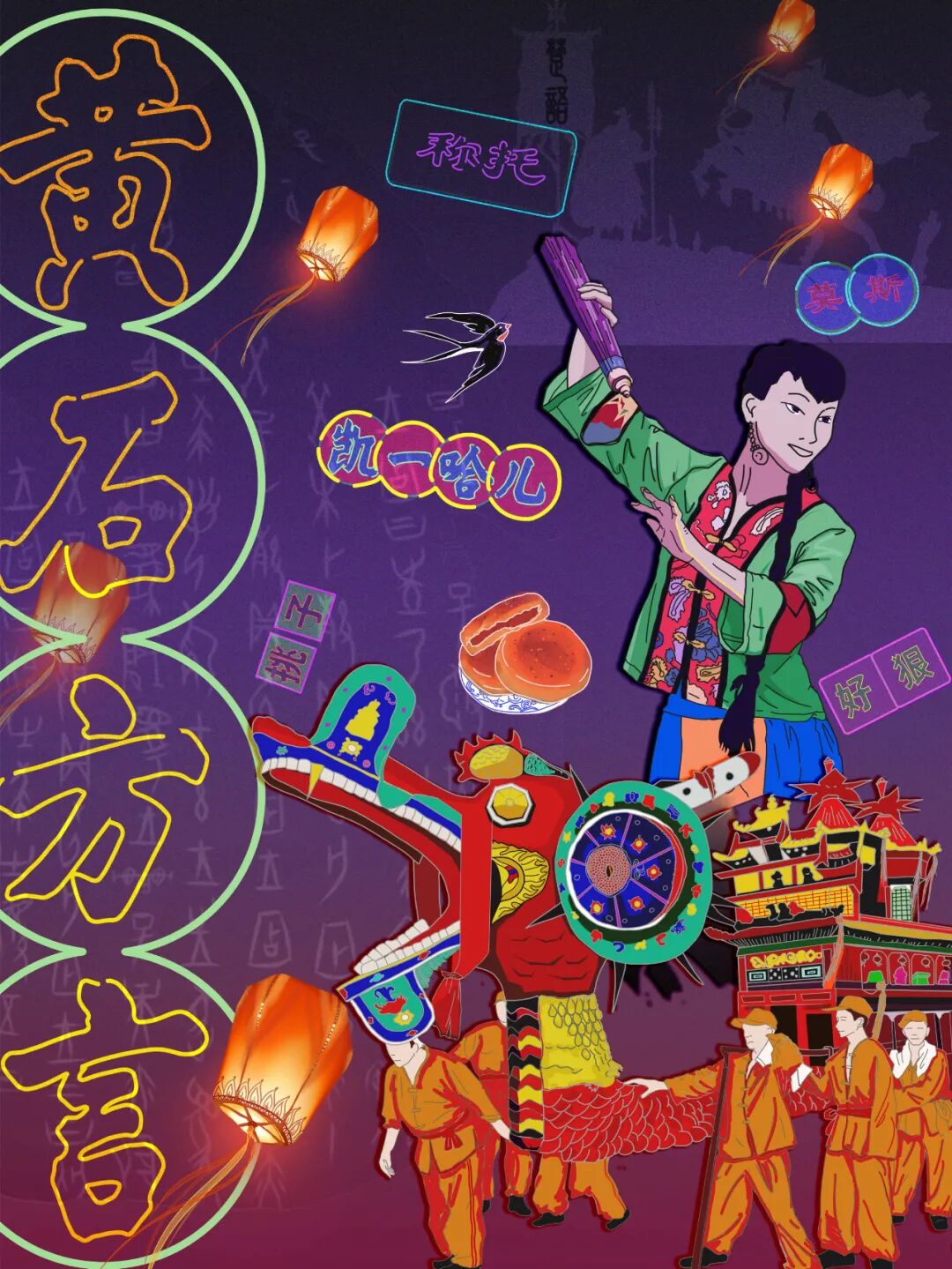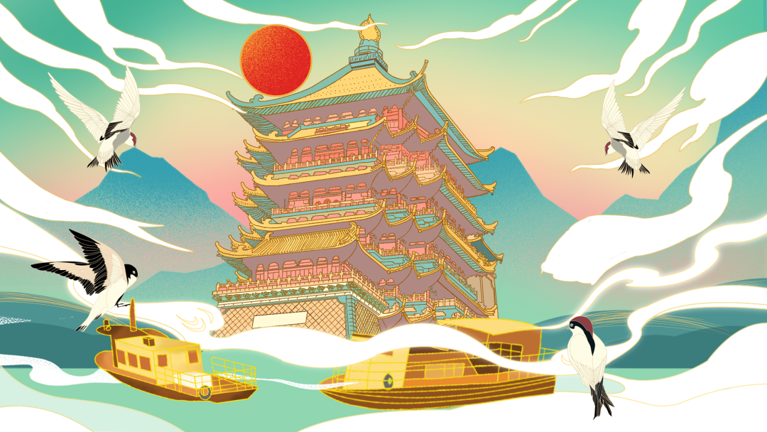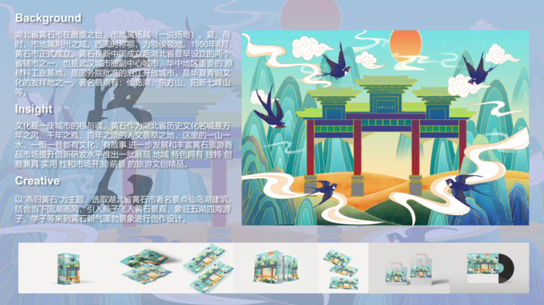 作品说明:以“燕归黄石”为主题,选取湖北省黄石著名景点东方山、仙岛湖等,结合当下国潮画风,引入燕子飞入黄石景观,象征五湖四海游子、学子等来到黄石朝气蓬勃景象进行创作设计。