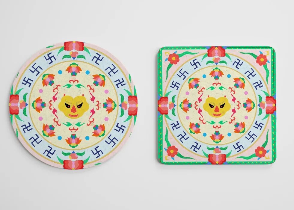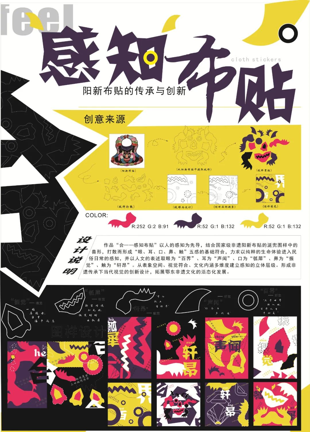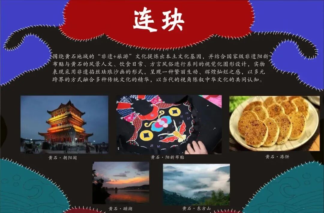 作品说明:围绕黄石地域的“非遗+旅游”文化提炼本土文化基因,并结合国家级非遗阳新布贴与黄石风景人文、饮食日常、方言风俗进行系列的视觉化图形设计,作品“合——感知布贴”以人的感知为先导,结合国家级非遗阳新布贴的涎兜图样中的兽形,打散而形成“眼、耳、口、鼻、触”五感的基础符合,连玦实物表现采用非遗掐丝珐琅沙画的形式,呈现一种繁丽生动、辉煌灿烂之感,以多元跨界的方式融合多种传统文化的精华,以当代的视角陈叙中华文化的共同认知。