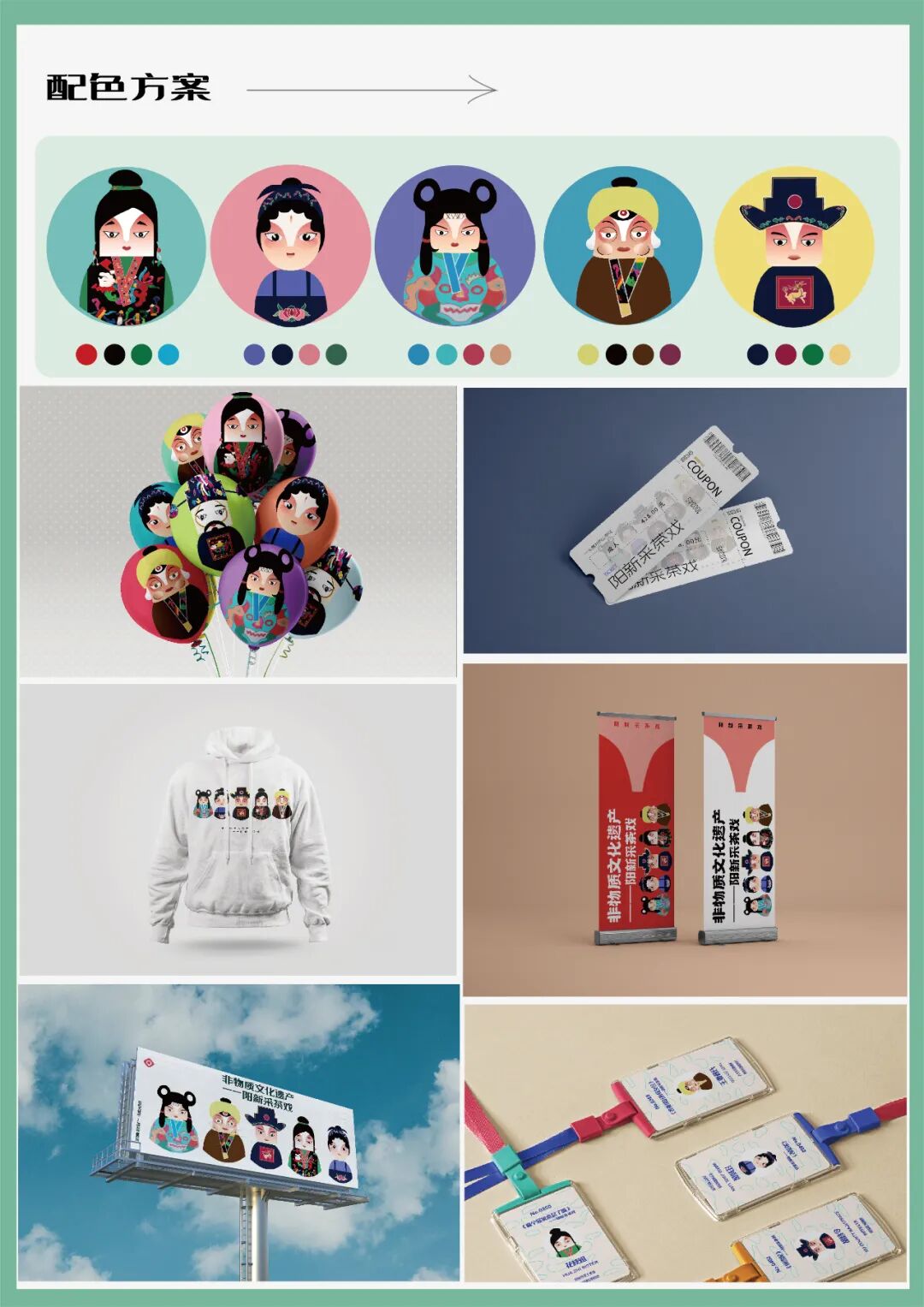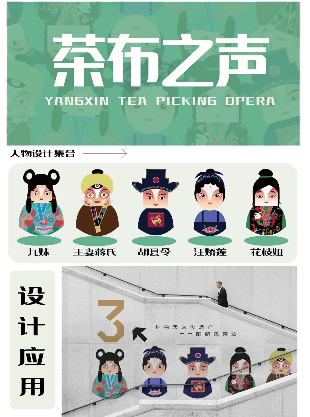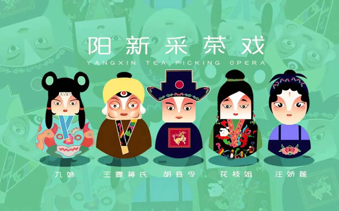 作品说明:以“阳新采茶戏”人物形象为主,结合了“阳新布贴”的纹样、色彩等特征与人物服饰相结合,对采茶戏经典戏剧“风雪配”、“阳二春访友”等剧中的人物形象进行了再设计,设计出“茶布之声”系列主题人物形象。