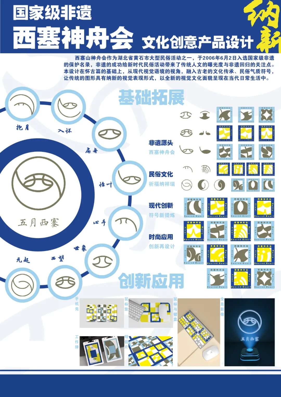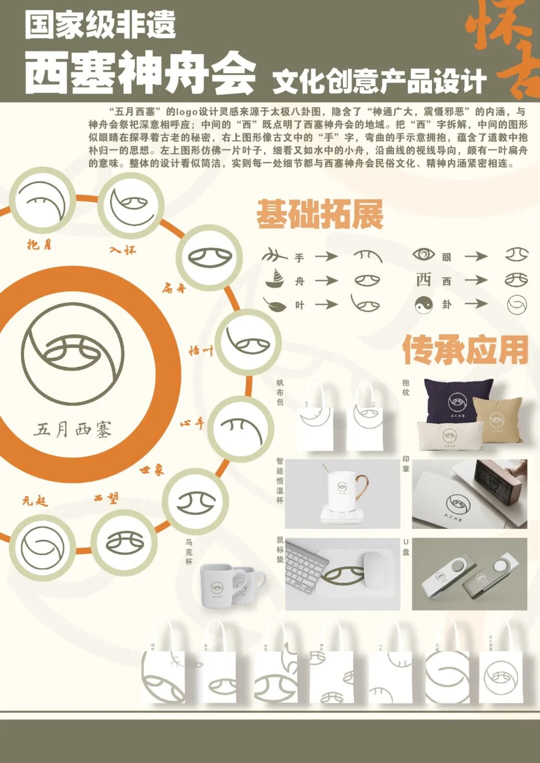 作品说明:西塞神舟会作为联合国非物质文化遗产,承载着古今人们的寄托。从“怀古”和“创新”的角度出发,logo的设计灵感源于太极八卦图,隐含“神通广大,震慑邪恶”的内涵。不同的符号衍生出不同的含义,将“西”字拆解,中间的图形似眼睛在探寻古老的秘密,右上图形像古文中的“手”字,示意拥抱,蕴含道教抱朴归一的思想。在怀古的基础上从现代视觉语境的视角,融入古老的文化传承、民俗符号,让传统的图形具有纳新的视觉表现形式,以全新的视觉文化面貌呈现在当代生活中。