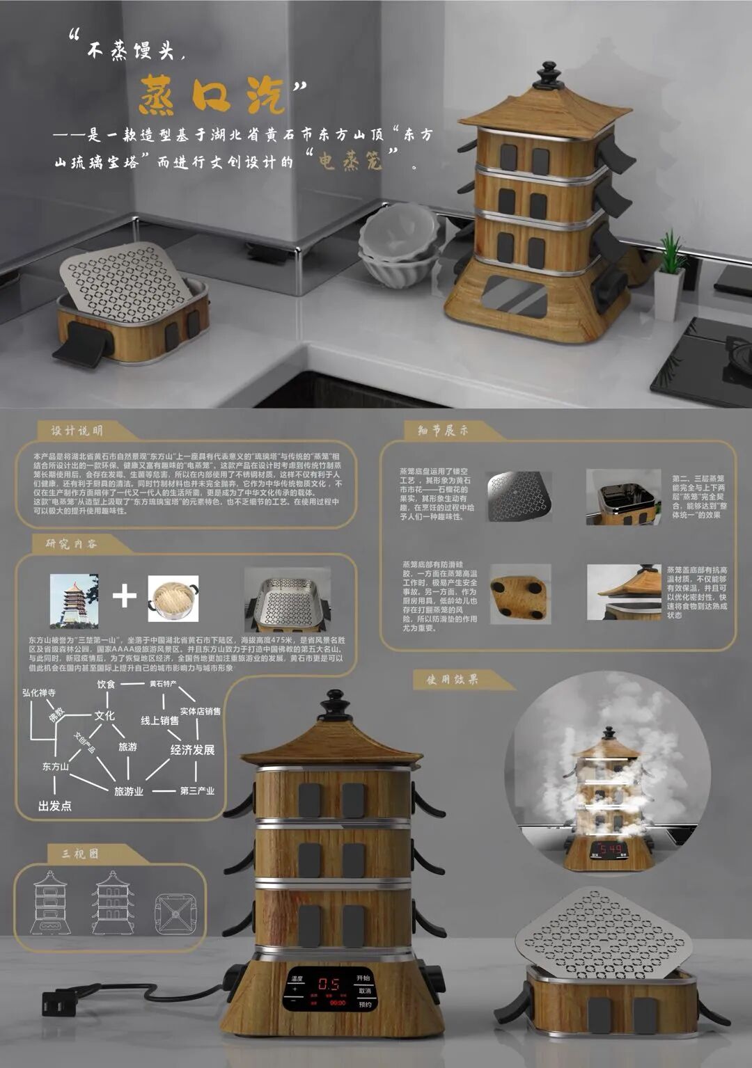 作品说明:“不蒸馒头,蒸口汽”电蒸笼是将湖北省黄石市自然景观“东方山”上一座具有代表意义的“琉璃塔”与传统的“蒸笼”相结合所设计出的一款环保、健康又富有趣味的“电蒸笼”。该产品共分为四层,前三层为蒸笼主体部分,最底层为加热部分(通过电力加热,使水分蒸发,从而达到使食品熟成的目的)。