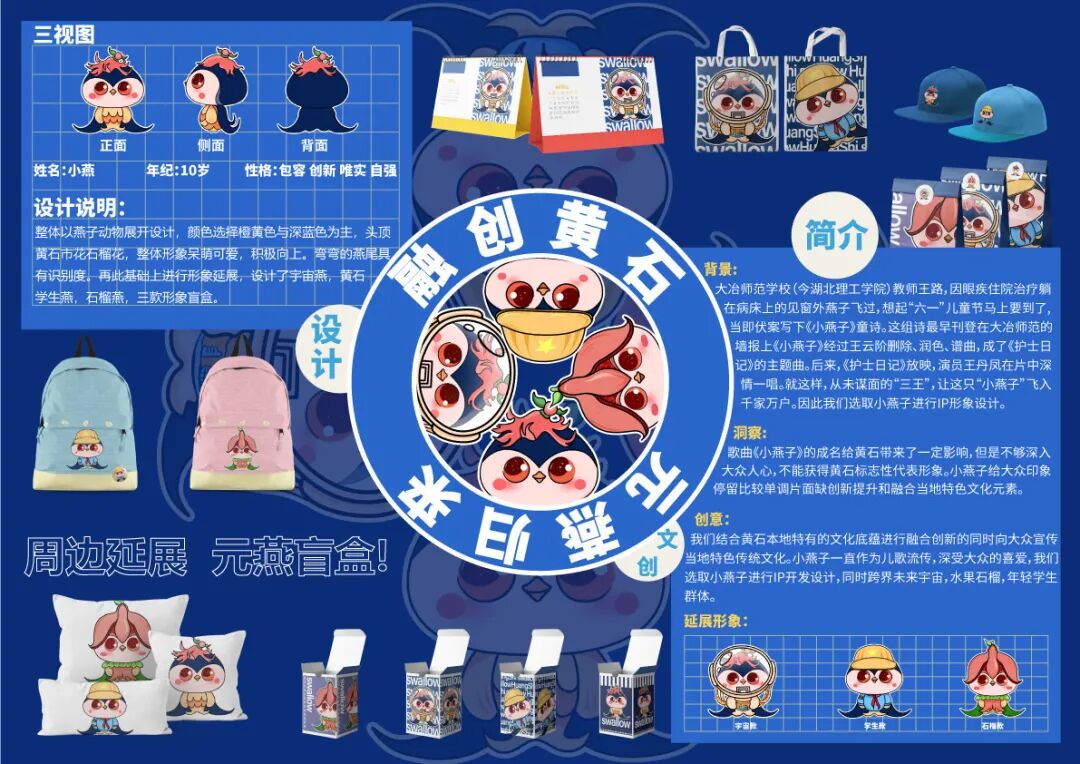 作品说明:结合黄石本地特有的文化底蕴进行融合创新,同时向大众宣传当地特色传统文化。小燕子一直作为儿歌流传,深受大众的喜爱,我们选取小燕子进行IP开发设计,同时跨界未来宇宙,水果石榴,年轻学生群体。