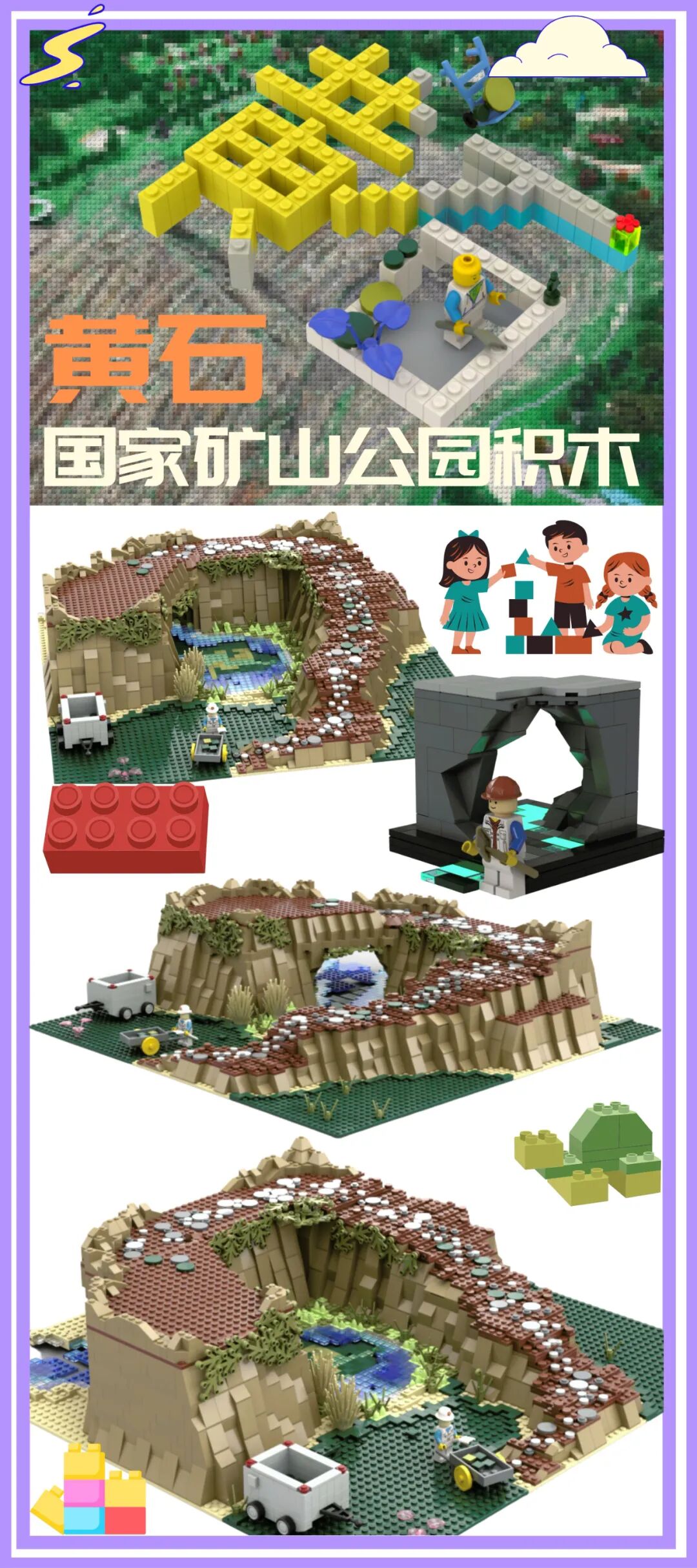 作品说明:黄石国家矿山公园积木,使用基础塑料积木件进行拼搭,通过对黄石矿山公园的还原来突出这一人工著名景观。