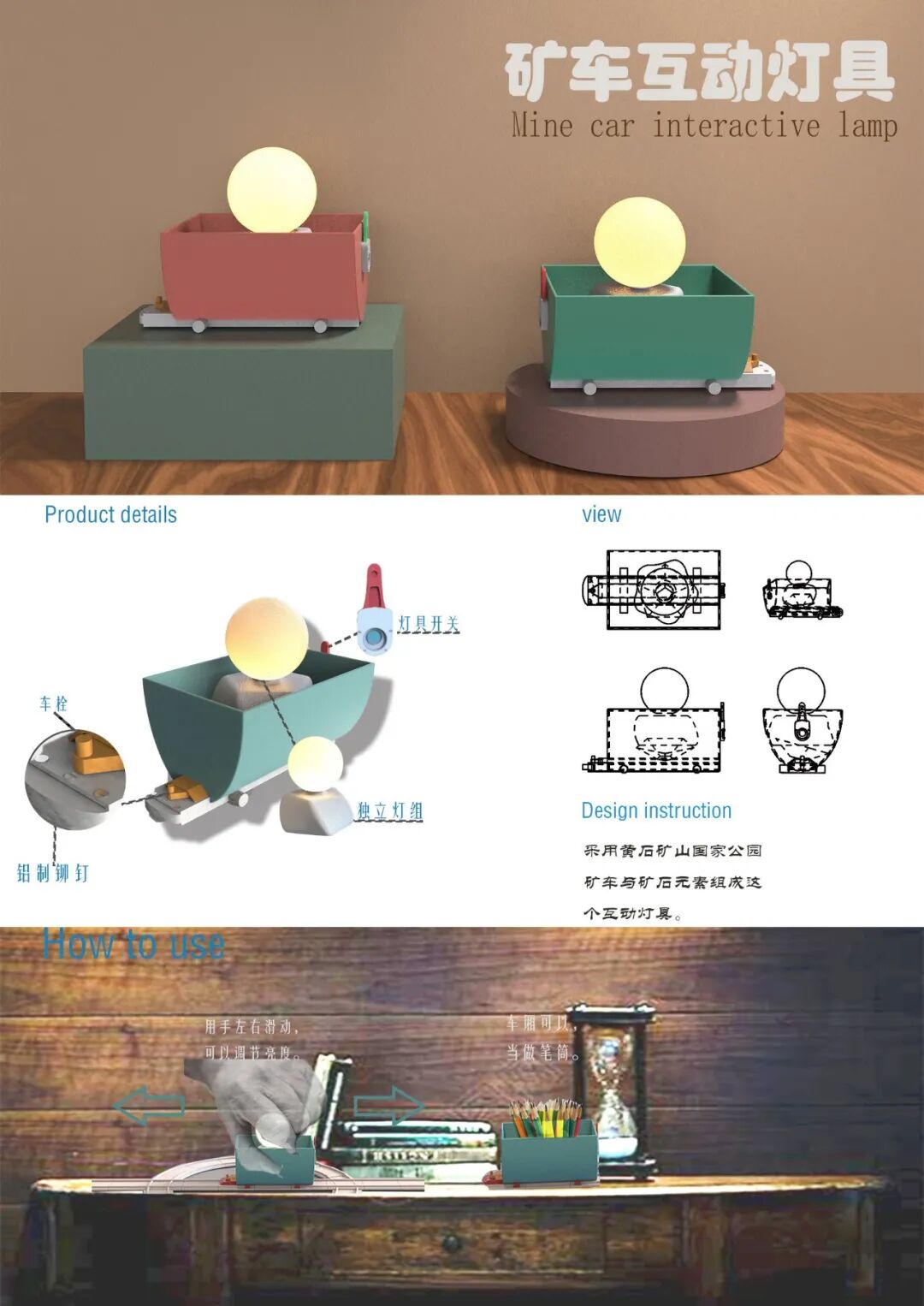 作品说明:采用黄石矿山国家公园矿车与矿石元素组成这个互动灯具,改变一般灯具交互方式,在铁轨上左右滑动增加趣味性。