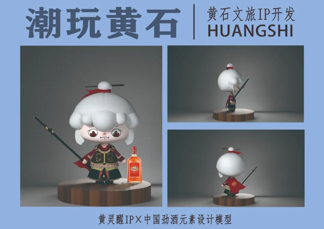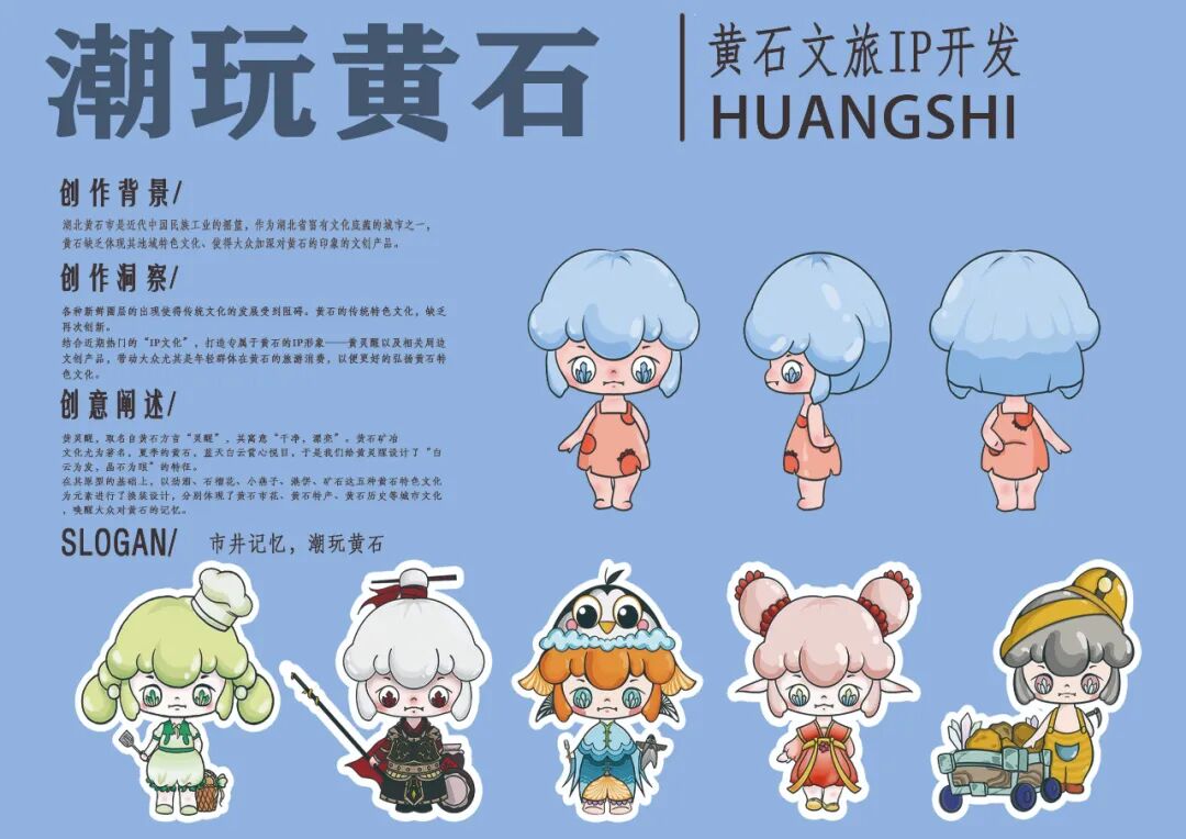 作品说明:结合近期热门的“IP文化”,打造专属于黄石的IP形象——黄灵醒以及相关周边文创产品。黄灵醒,取名自黄石方言“灵醒”,其寓意“干净,漂亮”。黄石矿冶文化尤为著名,夏季的黄石,蓝天白云赏心悦目,于是我们给黄灵醒设计了“白云为发,晶石为眼”的特征。