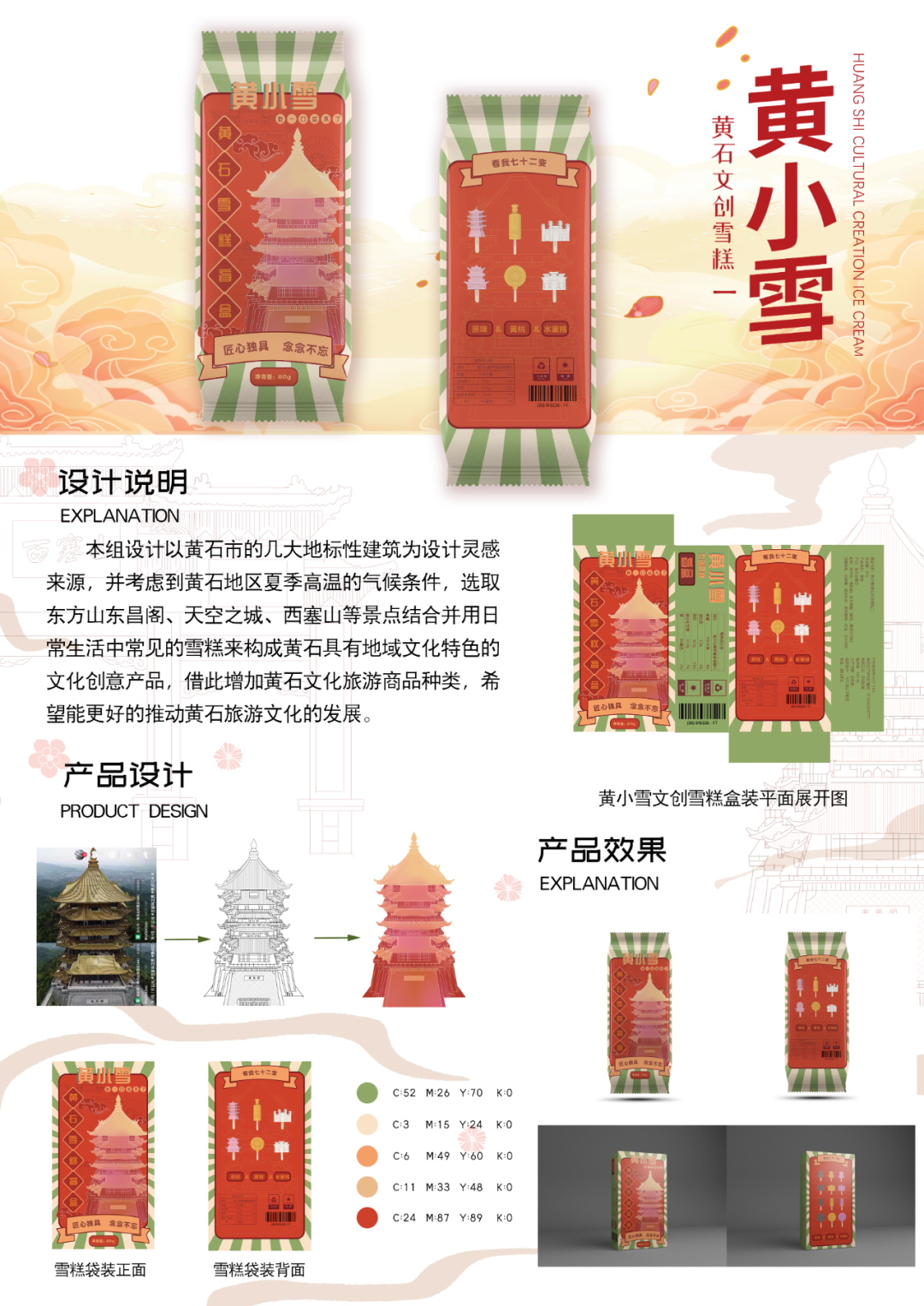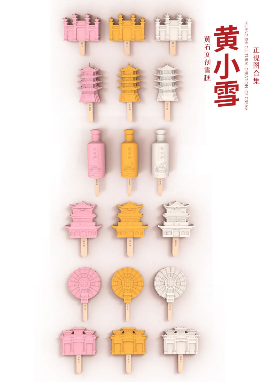 作品说明:以黄石几大地标性建筑为设计灵感来源,选取朝阳阁、西塞山、东方山东昌阁、天空之城、雷山、磁湖醉等景点结合并用日常生活中常见的雪糕来构成黄石具有地域文化特色的文化创意产品,借此增加黄石文化旅游商品种类,希望能更好的推动黄石旅游文化的发展。