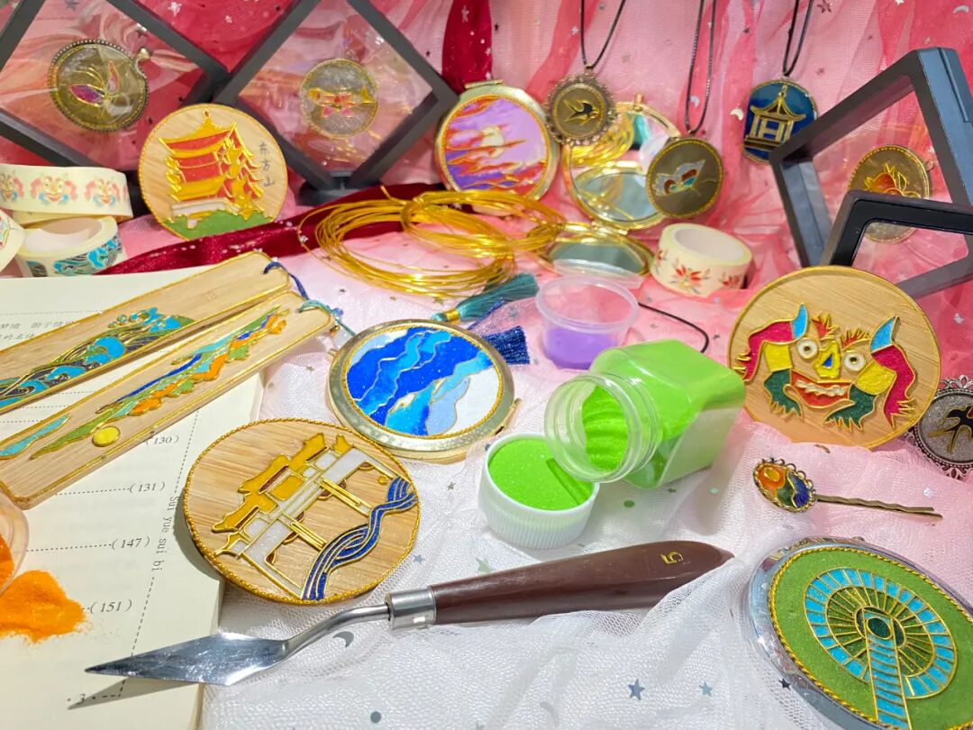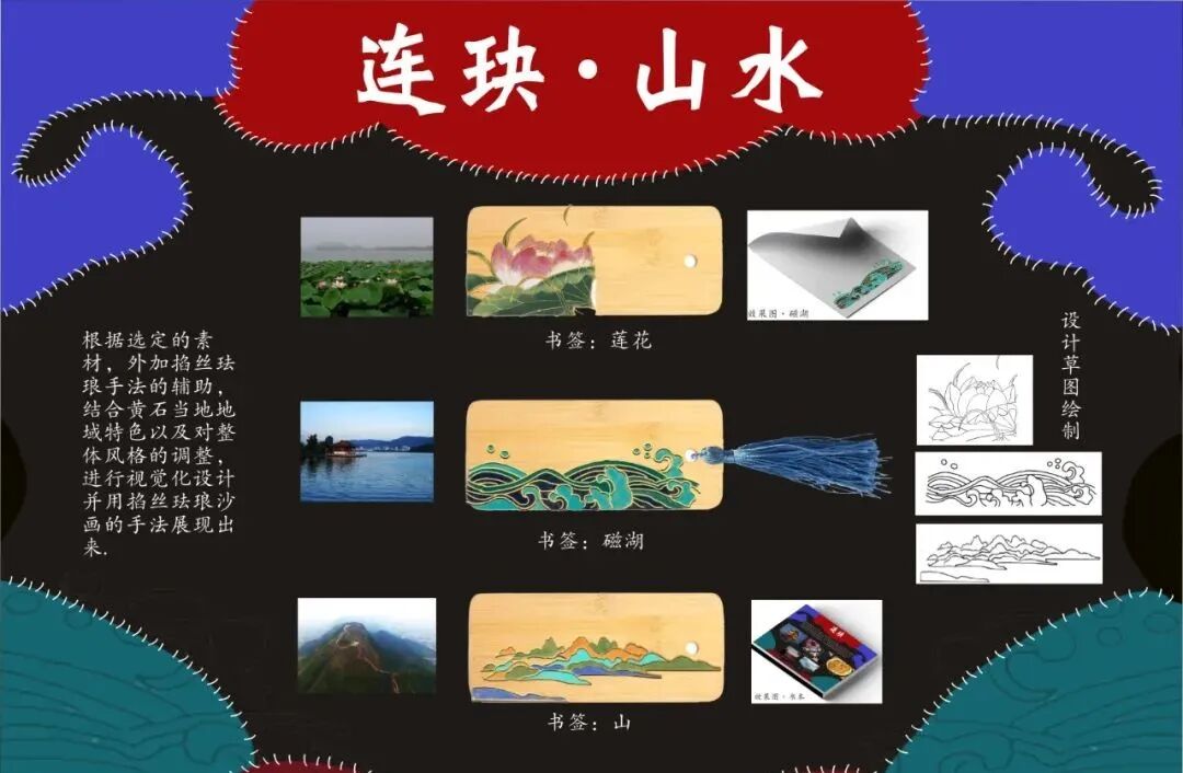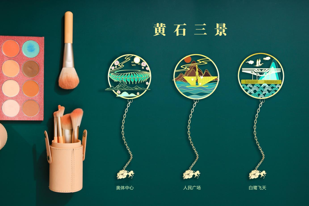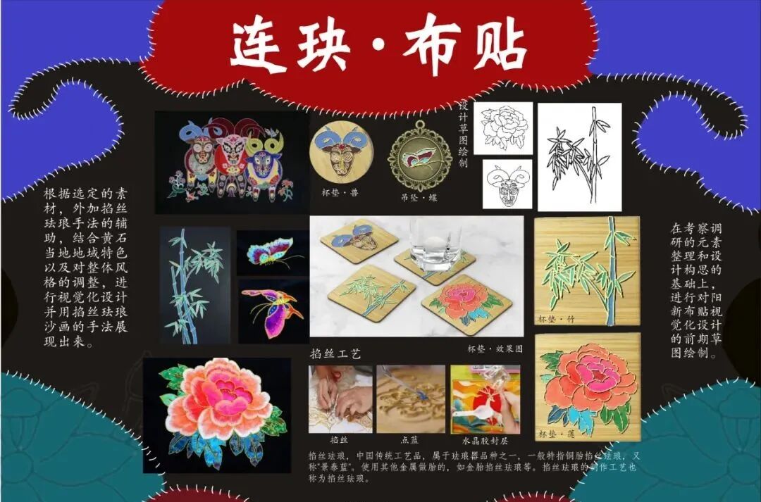 作品说明:连玦是掐丝景泰蓝,是一种工艺品,我们以黄石的风景,建筑,市花等各种元素进行了制作。合-感知系列是以阳新布贴的纹样,元素展开的设计,因为阳新布贴是国家级非物质文化遗产,我们提取黄石文化中的一个重点进行的再设计,属于文创系列产品。