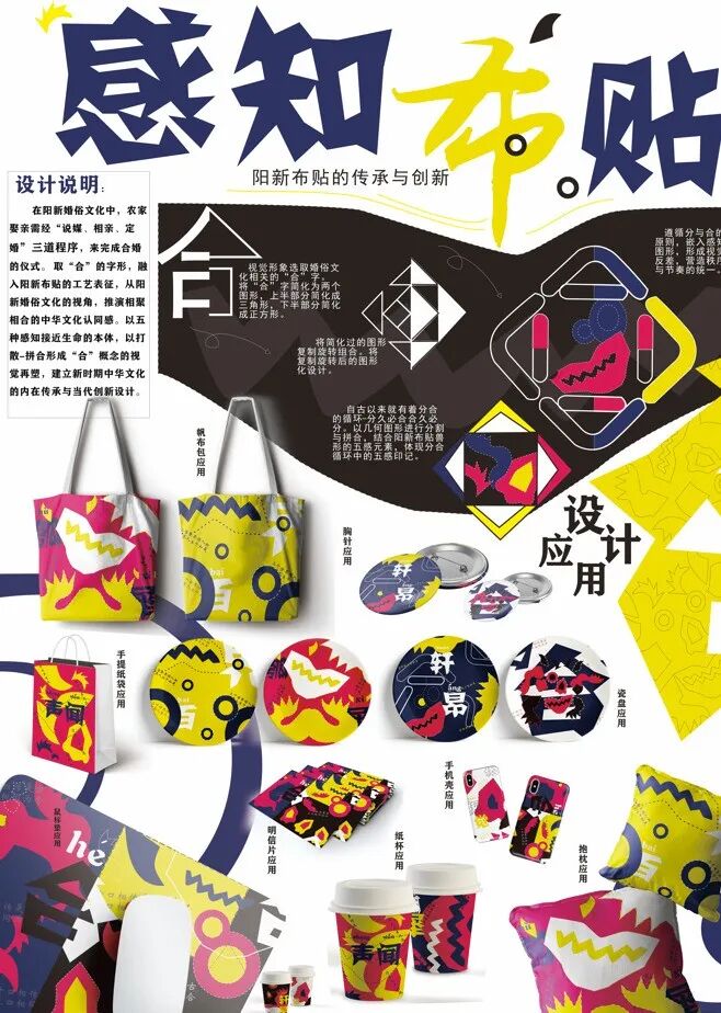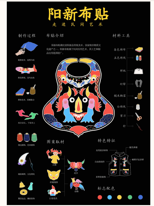作品说明:以儿童围兜为主体介绍了阳新布贴的制作流程、材料工具、特色特征、传承保护等。再利用手绘的图案制作了文创产品,在制作的过程中保留了阳新布贴的基本特征。让更多人了解阳新布贴,感受黄石文化的魅力。让传统文化与现代化相结合,不遗忘历史文化,让它们以更贴近日常生活的方式不断向我们靠近,越来越年轻化、越来越鲜活有力。