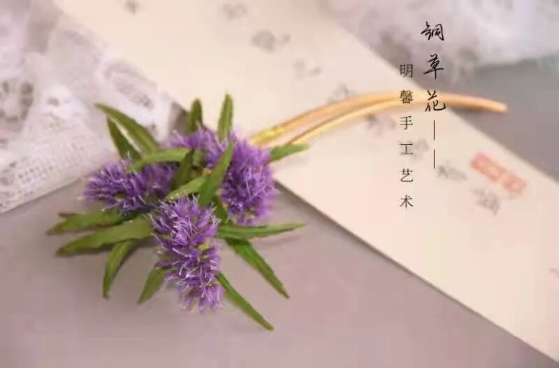 作品说明:铜草花是一种能比较准确显示铜矿藏地的特色植物,它只生长在含有铜元素的土壤里。商周时期智慧的先民通过铜草花发现了惊艳世界的铜绿山矿。选取铜草花作为黄石文创设计更具有代表性。运用布艺设计和制作出铜草花胸针、铜草花发簪、铜草花扇面,均由纯手工匠心制作。铜草花花型似牙刷,在制作上有一定难度,但经过多次研究与反复试验,现在的铜草花制作已经更加逼真。2020年12月,铜草花胸针已经被黄石市博物馆作为代表性文创作品,其制作工艺已申请国家外观专利。后面将研究和制作出有关铜草花更多的系列作品进行推广。