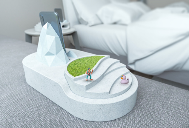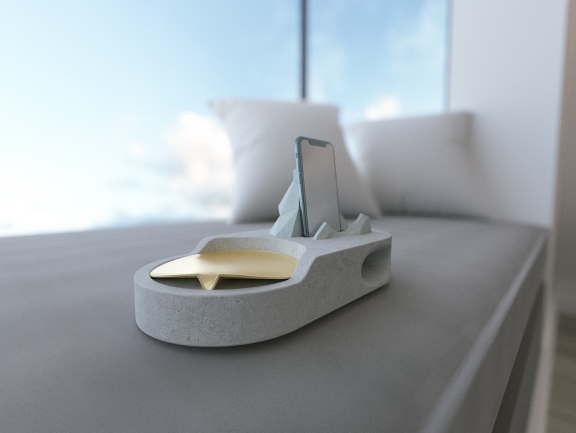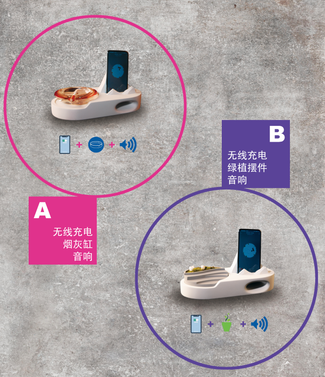 作品说明:特种水泥制作而成,产品分为A、B两款,A款是充电器+一个水泥绿植花盆,可以用来种绿植,桌面布景,花盆可以拿起来与基座脱离;B款是充电器+一个铜制的烟灰缸,烟灰缸可以拿起来与基座脱离。将手机靠在冰山上,即可为手机无线充电,同时基座的设计让手机在播放音乐时有了物理扩音和美音的效果。