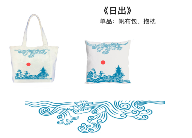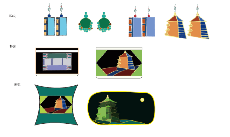 作品说明:此次作品灵感来源于本市景点东方山,耳环、杯套、抱枕等系列作品用传统手法阳新布贴加上一些新的设计理念打造一种不同的美感,使传统文化更贴近于生活。工艺技法上耳环、杯套和抱枕都会采用贴布绣和刺绣结合的手法。“日出”系列则以东方山塔、早晨的云雾为主要设计设计元素,简化了塔的造型,象征性的表现出耸立在东方山上的大气,一览黄石;云雾做了正负形分割处理,分为上负下正板块,使画面更加丰富,色调以布贴基本色—蓝色调为主,日出用鲜艳的红色,如同打破了早晨的清冷,使画面更加和谐而不失格调。整体图案将采用热印染和刺绣的工艺制作。水波纹利用热印染工艺,红日用立体刺绣的手法让其具有立体感和光泽感。