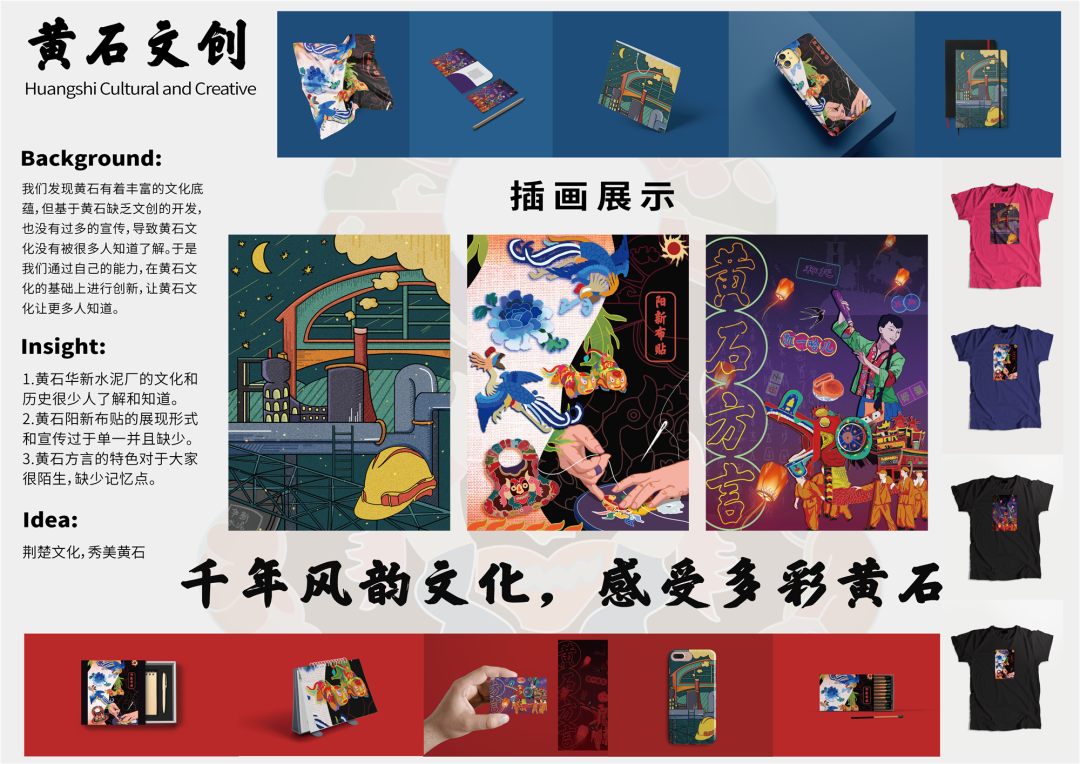 作品说明:我们的遇见黄石系列作品,通过三张插画产生其文创衍生品,三张插画用不同的风格与黄石文化结合,孟菲斯风格与华新水泥厂结合,贴画风格与阳新布帖结合,霓虹灯风格与黄石方言结合。用创新的风格,用文创的方式,让大家更加了解黄石文化,让大家更愿意去了解这个城市浓厚的文化底蕴。