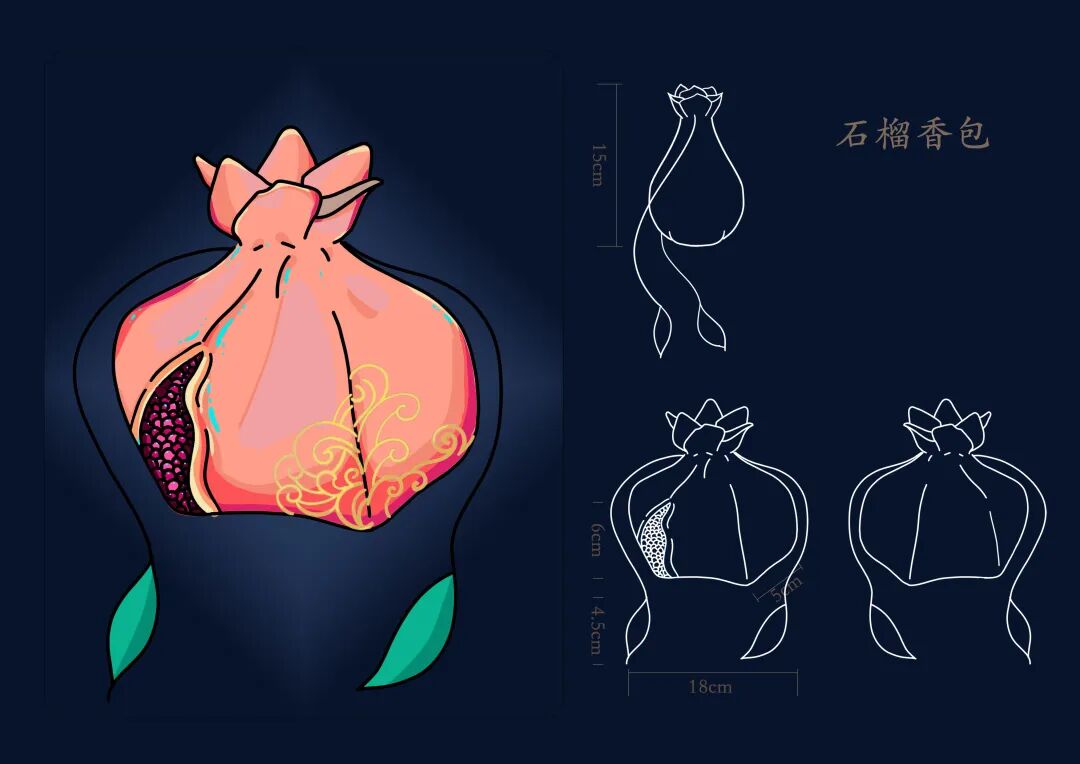 作品在中华传统服饰配件中加入石榴花的元素,形成了含香囊、发簪和压襟的女红系列作品。黄石市栽培石榴的历史悠久,石榴不仅是黄石市的市花,还是黄石历史文化的代表。色彩上采用非遗阳新布贴中极具代表性的鲜亮色系,既展现了黄石市的地域文化特色,又体现了黄石奋发有为的精神面貌。女红系列的形式也源于阳新布贴中婆媳传承的关系。布艺材质和服饰配件的形式增添文创产品使用价值,也希望承载着黄石精神的石榴能走进人们的生活。
