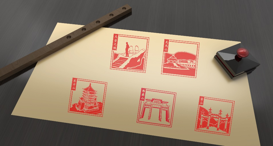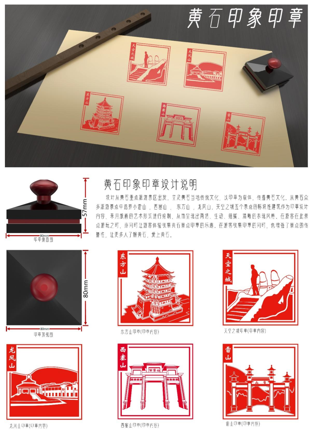 设计从黄石重点旅游景区出发,立足黄石当地传统文化,以印章为载体,传播黄石文化。从黄石众多旅游景点中选择小雷山,西塞山,东方山,龙凤山,天空之城五个景点的标识性建筑作为印章设计内容,采用版画的艺术形式进行绘制,从而呈现出简洁、生动、细腻、清晰的表现风格。在游客在此景点游玩之时,亦同时让游客体验收集黄石景点印章的乐趣。在游客收集印章的同时,也增强了景点的传播性,让更多人了解黄石,爱上黄石。