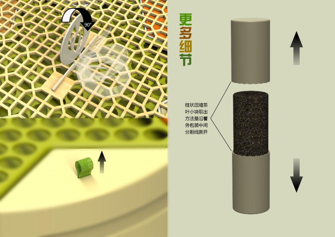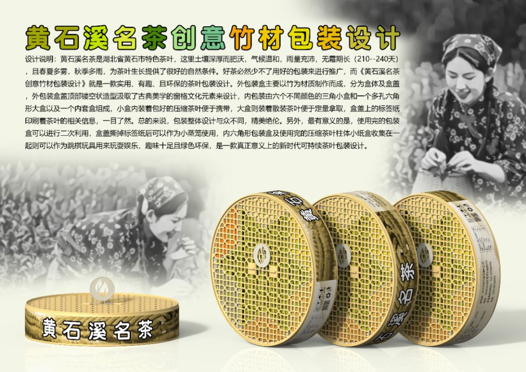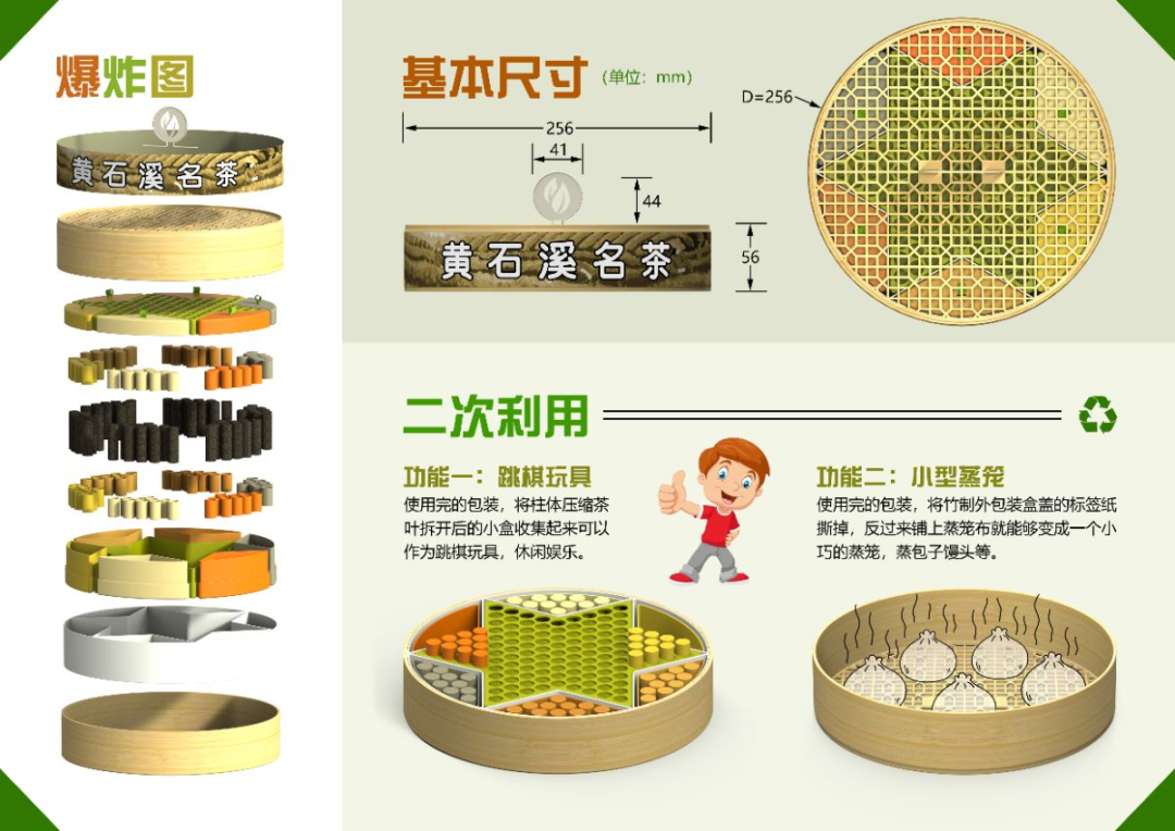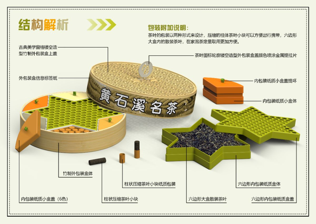 黄石溪名茶是湖北省黄石市特色茶叶,好茶必然少不了用好的包装来进行推广,而《黄石溪名茶创意竹材包装设计》就是一款实用、有趣、且环保的茶叶包装设计。外包装盒主要以竹为材质制作而成,分为盒体及盒盖外包装盒盖顶部锁空状造型汲取了古典美学的窗格文化元素来设计,内包装由六个不同颜色的三角小盒和一个多孔六角形大盒以及一个内套盒组成,小盒内装着包好的压茶叶便于携带,大盒则装着散装茶叶便于定量拿取,盒盖上的标签纸印刷着茶叶的相关信息,一目了然。另外,使用完的包装盒可以进行二次利用,盒盖撕掉标签纸后可以作为小蒸笼使用,内六角形包装盒及使用完的压缩茶叶柱体小纸盒收集在一起则可以作为跳棋玩具用来玩要娱乐,趣味十足且绿色环保,是一款真正意义上的新时代可持续茶叶包装设计。