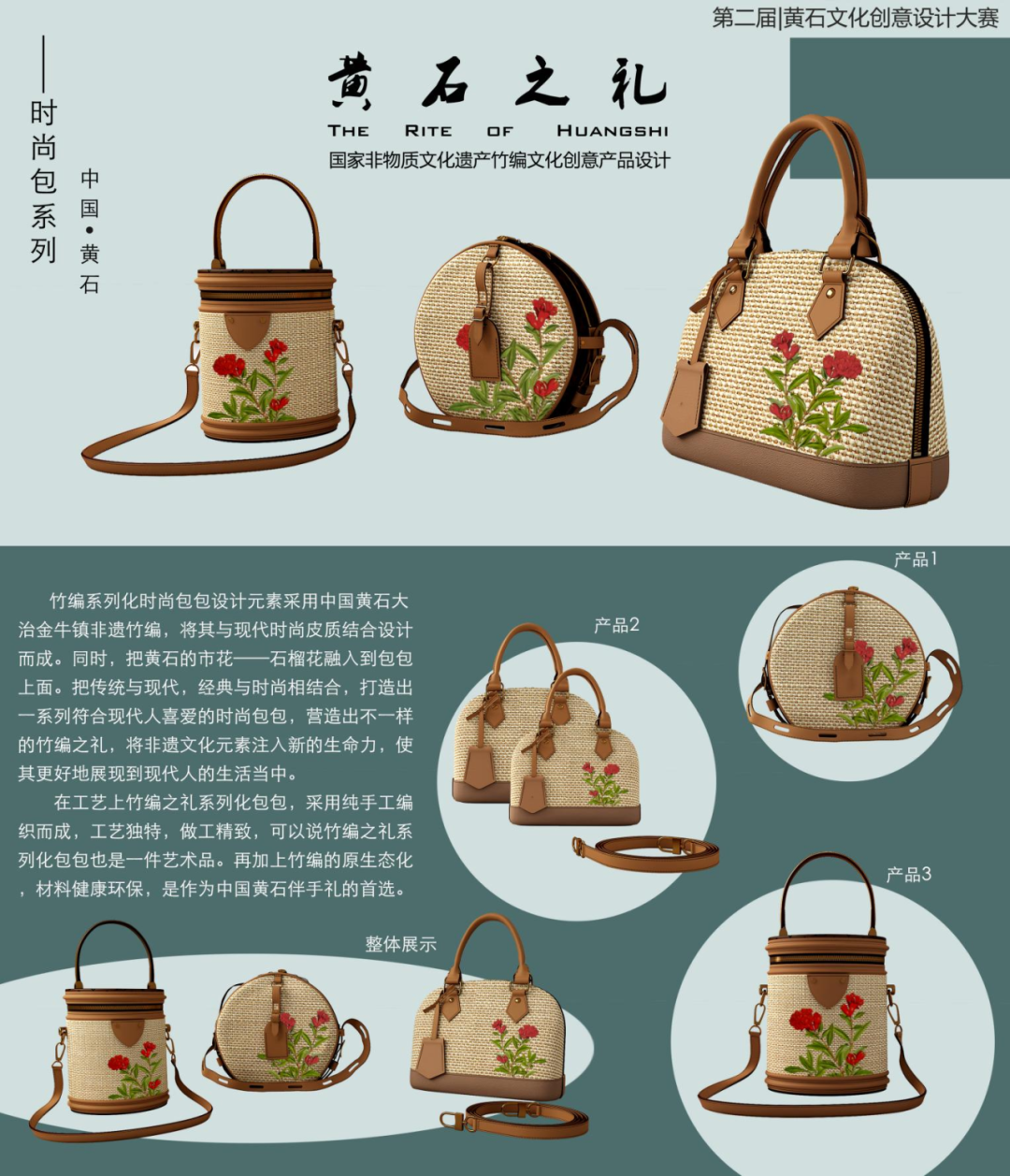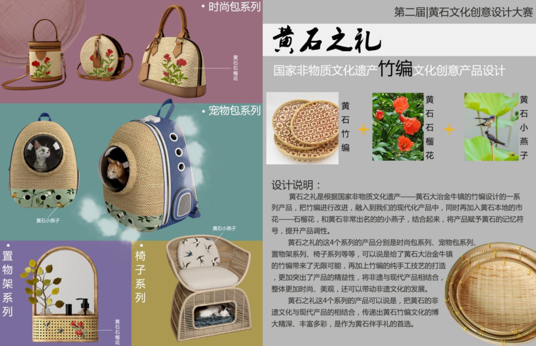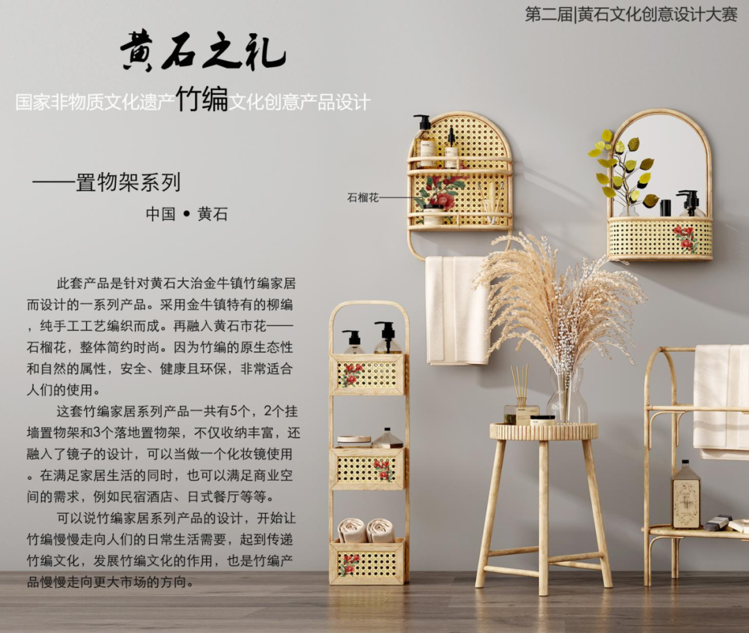 黄石之礼是根据国家非物质文化遗产——黄石大冶金牛镇的竹编设计的一系列产品,把竹编进行改进,融入到我们的现代化产品中,同时再加入黄石本地的市花一一石榴花,和黄石非常出名的小燕子,结合起来,将产品赋予黄石的记忆符号,提升产品调性。