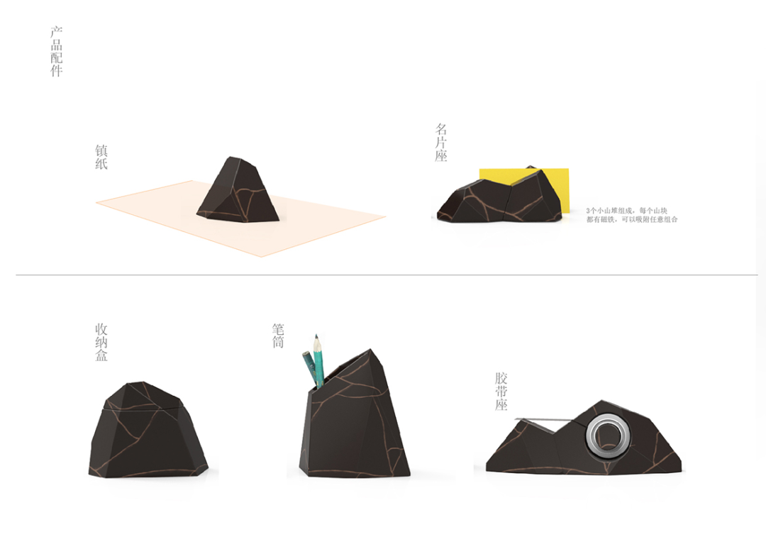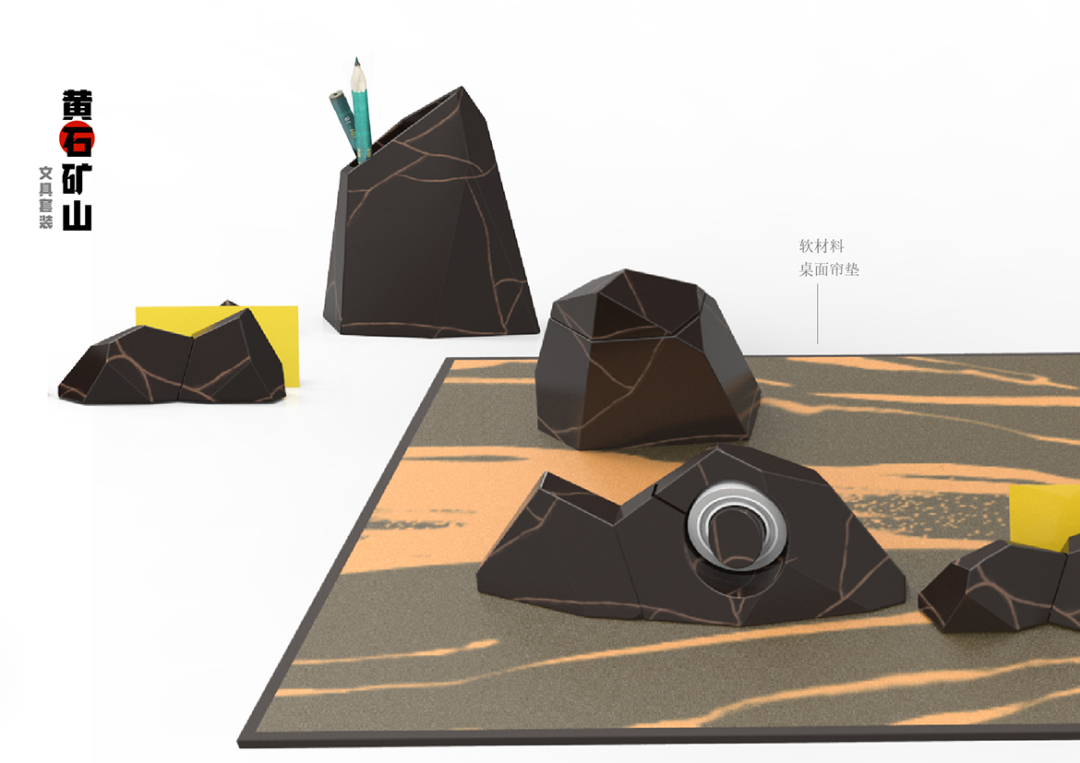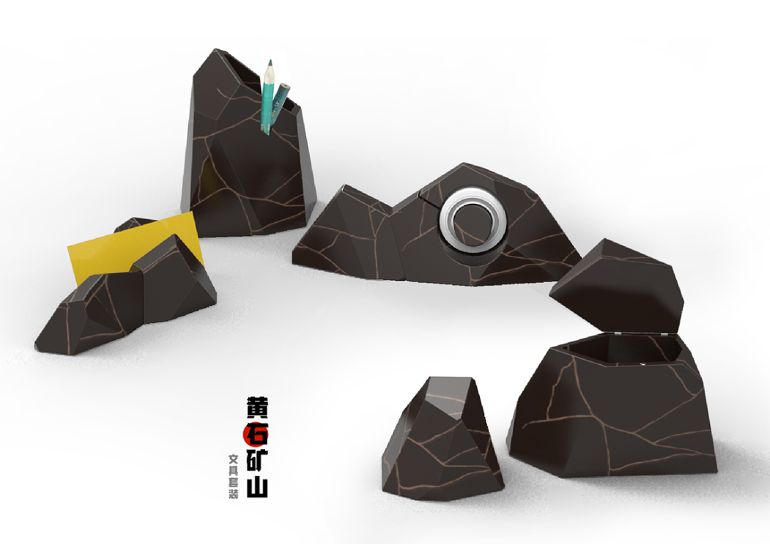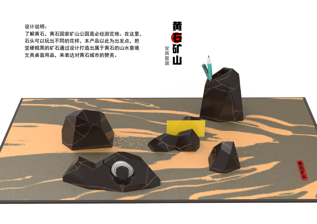 了解黄石,黄石国家矿山公园是必经游览地。在这里,石头可以玩出不同的花样,本产品以此为出发点,把坚硬粗黑的矿石通过设计打造出属于黄石的山水意境文具桌面用品,来表达对黄石城市的赞美。