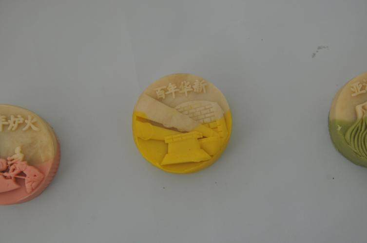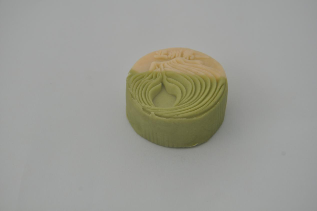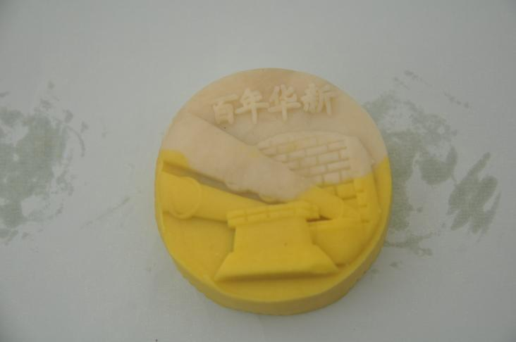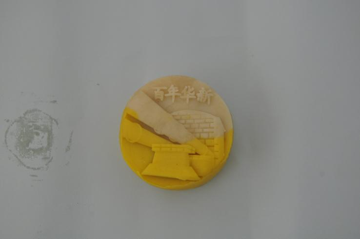 “百年华新”糕饼的饼面采用浮雕形式,细致的刻画了煅烧水泥管道,使得工业遗产能够成为城市文化的传承。饼皮原料采用双色过渡的桃山皮,用白+黄的色系进行组合,颜值爆棚。内馅采用红豆搭配薏米,喻百年长寿之意,给文创糕饼赋能。