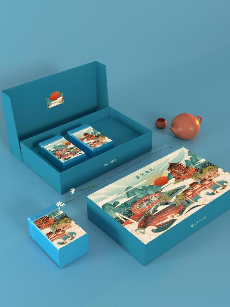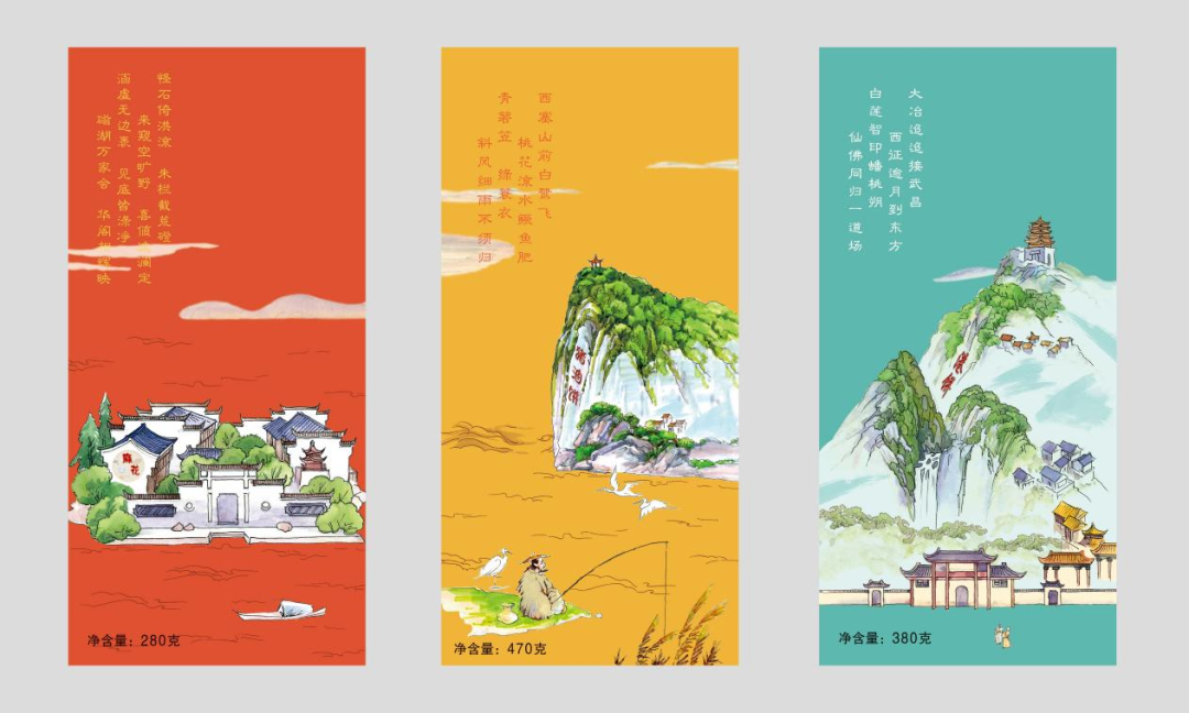 每款盒子的画面分别是张志和的《渔歌子》、王石朋的《东方山寺》以及孔仲武的《磁湖安流亭》诗词意境组成。并分别内置三张卡片,承载历史上到此地的名人及产品文化诉求。