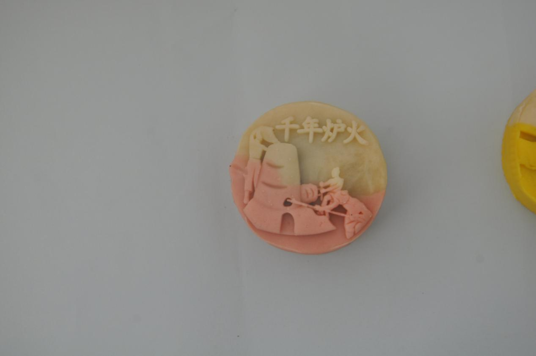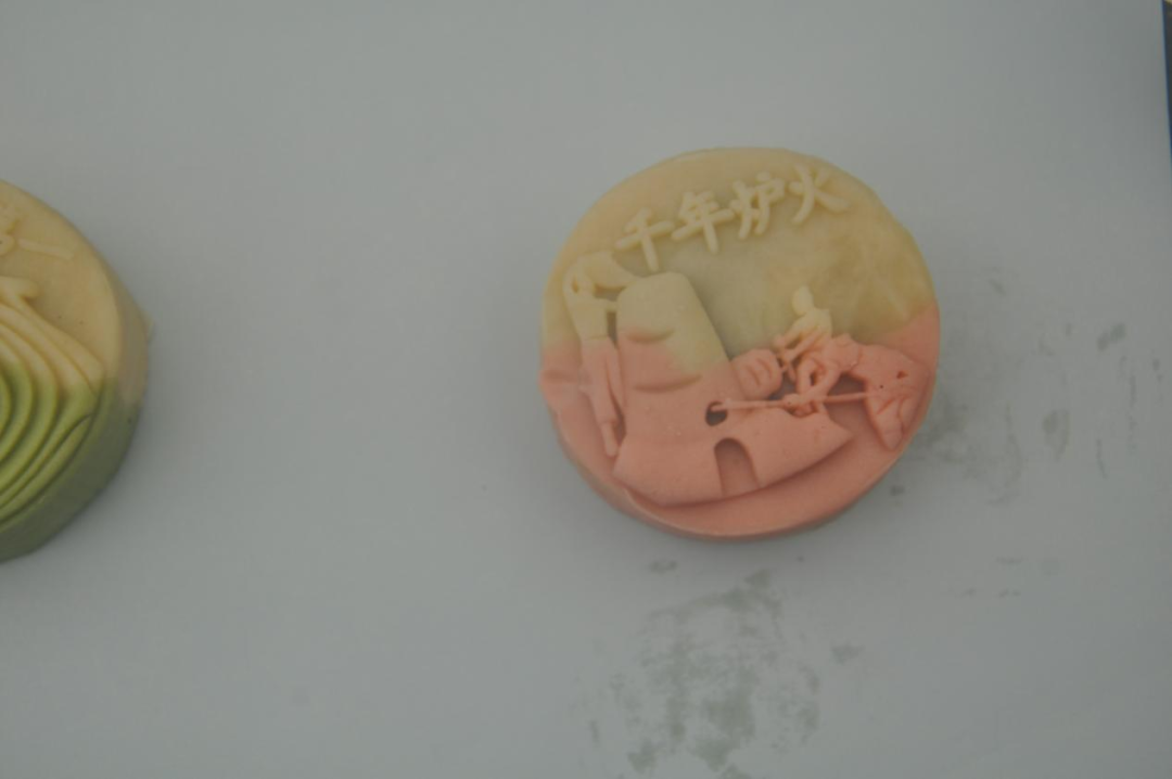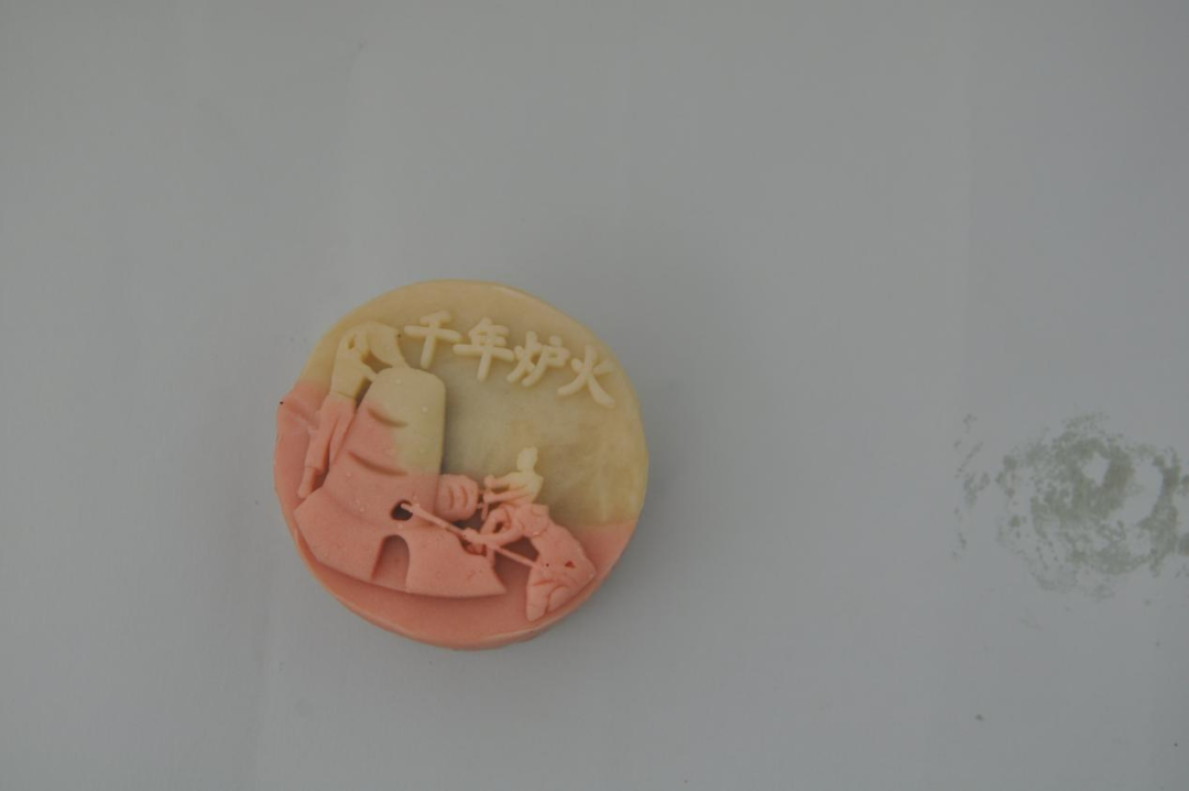 “千年炉火”糕饼的饼面采用浮雕形式,细致的刻画了三位古人在炉前冶炼的场景,使得工业遗址能够成为城市文化的传承。饼皮原料采用双色过渡的桃山皮,用白+红的色系进行组合,颜值爆棚。内馅用辣味的馅料,喻熊熊燃烧的炉火,千年不熄,给文创糕饼赋能。
