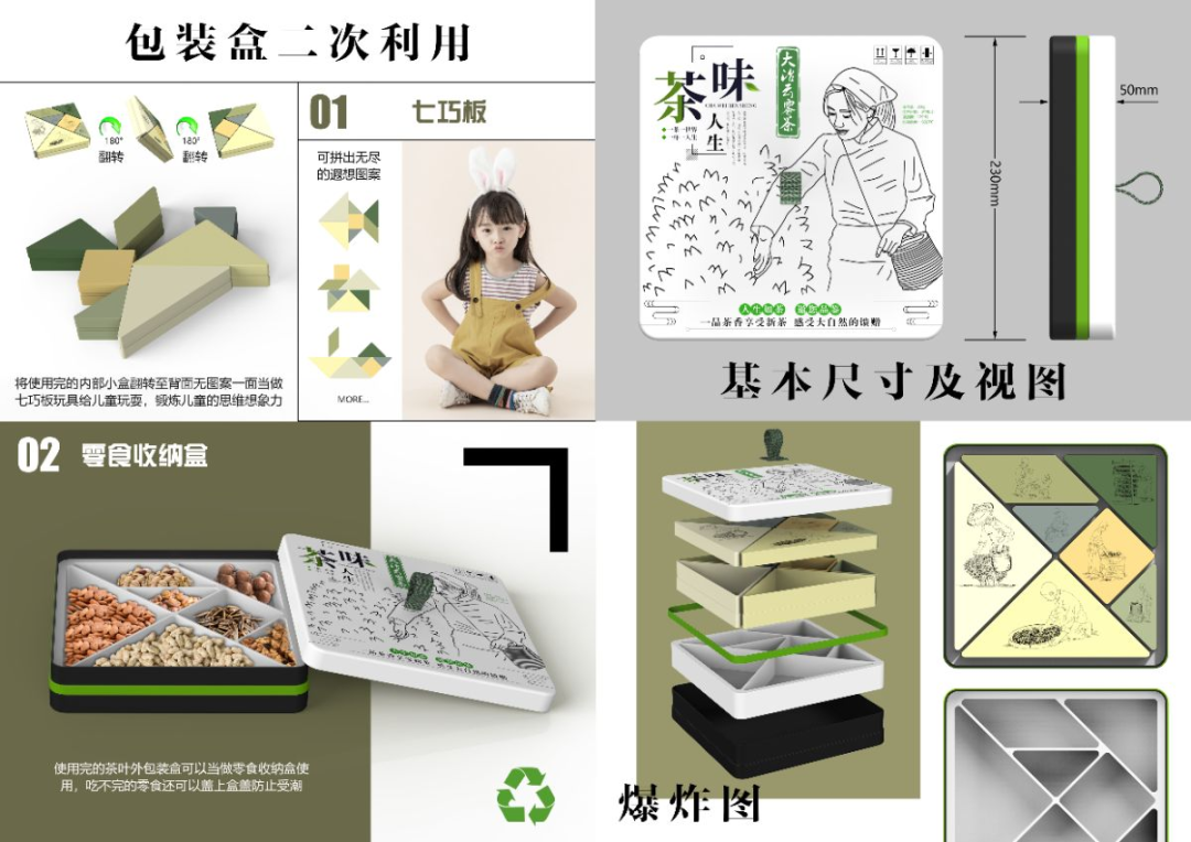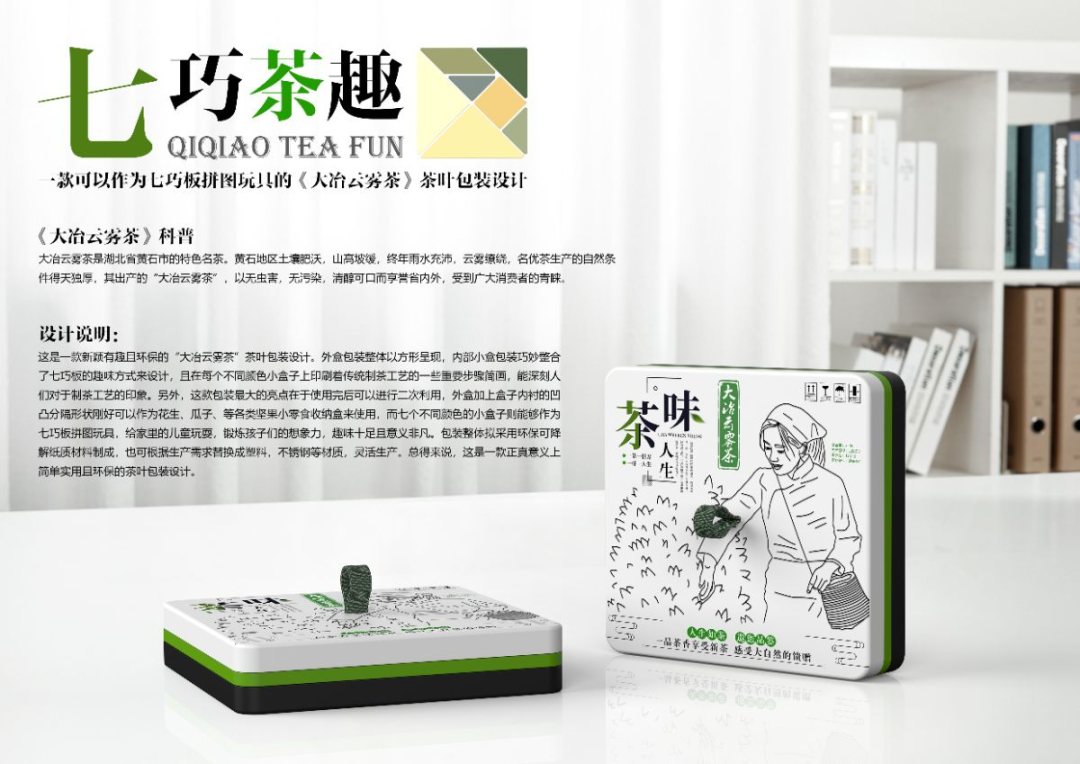 这是一款新颖有趣且环保的“大冶云雾茶”茶叶包装设计。外盒包装整体以方形呈现,内部小盒包装巧妙整合了七巧板的趣味方式来设计,且在每个不同颜色小盒子上印刷着传统制茶工艺的一些重要步骤简画,能深刻人们对于制茶工艺的印象。另外,这款包装最大的亮点在于使用完后可以进行二次利用,外盒加上盒子内衬的凹凸分隔形状刚好可以作为花生、瓜子、等各类坚果小零食收纳盒来使用,而七个不同颜色的小盒子则能够作为七巧板拼图玩具,给家里的儿童玩耍,锻炼孩子们的想象力,趣味十足且意义非凡。包装整体拟采用环保可降解纸质材料制成,也可根据生产需求替换成塑料,不锈钢等材质,灵活生产。总得来说,这是一款正真意义上简单实用且环保的茶叶包装设计。