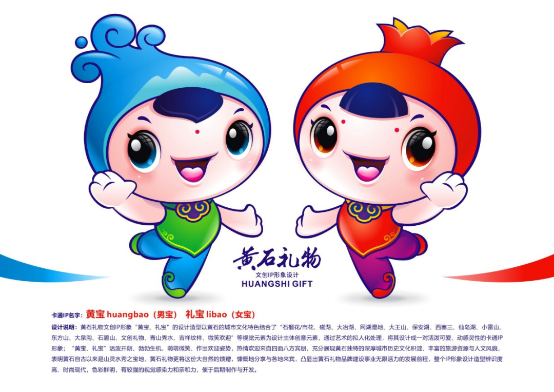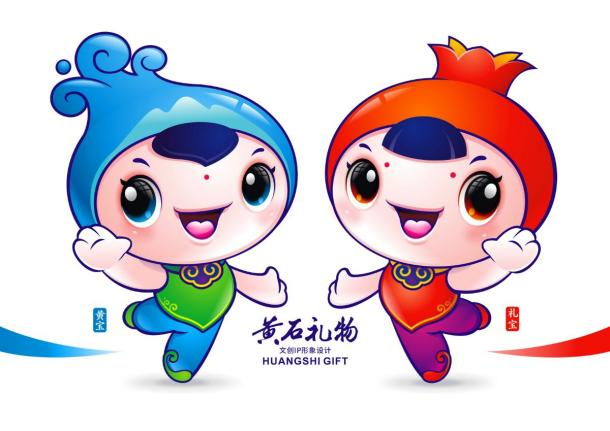 黄石礼物文创IP形象“黄宝、礼宝”的设计造型以黄石的城市文化特色结合了石榴花/市花。磁湖、大冶湖、网湖湿地、大王山,保安湖、西塞山、仙岛湖、小雷山、东方山、大泉沟。石碧山、文创礼物、清山秀水、吉祥纹样、微笑欢迎”等视觉元素为设计主体创意元素,通过艺术的拟人化处理,将其设计成一对活泼可爱、动感灵性的卡通IP形象;“黄宝、礼宝”活泼开朗、勃勃生机、萌萌微笑、作出欢迎姿势,热情欢迎来自四面八方宾朋,充分展现黄石独特的深厚城市历史文化沉淀、丰富的旅游资源与人文风貌,表明黄石自古以来是山林水秀之宝地,黄石礼物更将这份大自然的馈赠、慷慨地分享与各地来宾,凸显出黄石礼物品牌建设事业无限活力的发展前程,整个IP形象设计造型辨识度高、时尚现代、色彩鲜明,有较强的视觉感染力和亲和力,便于后期制作与开发。