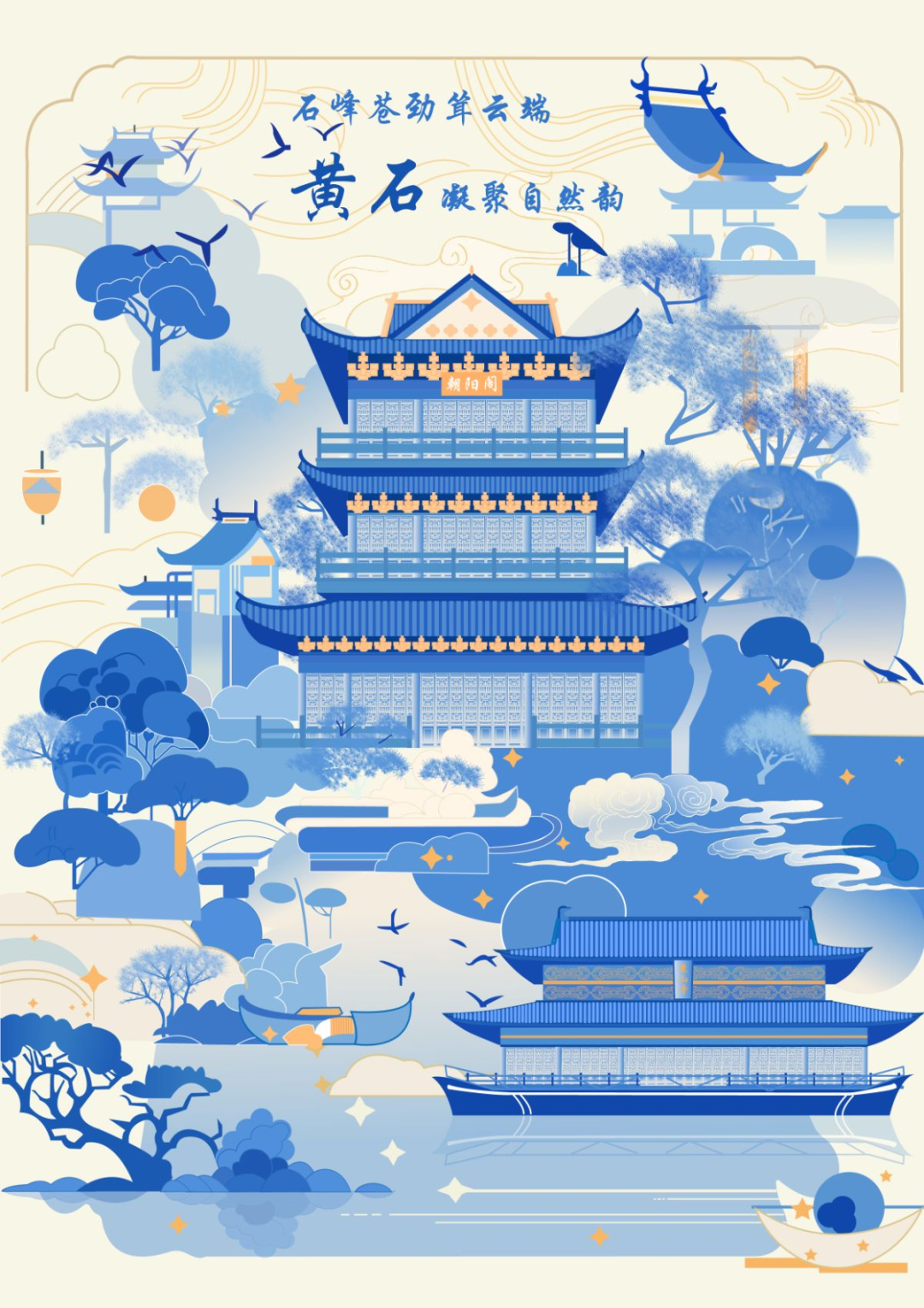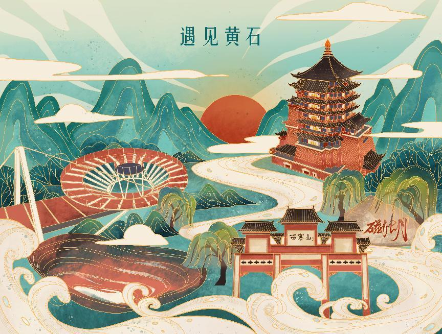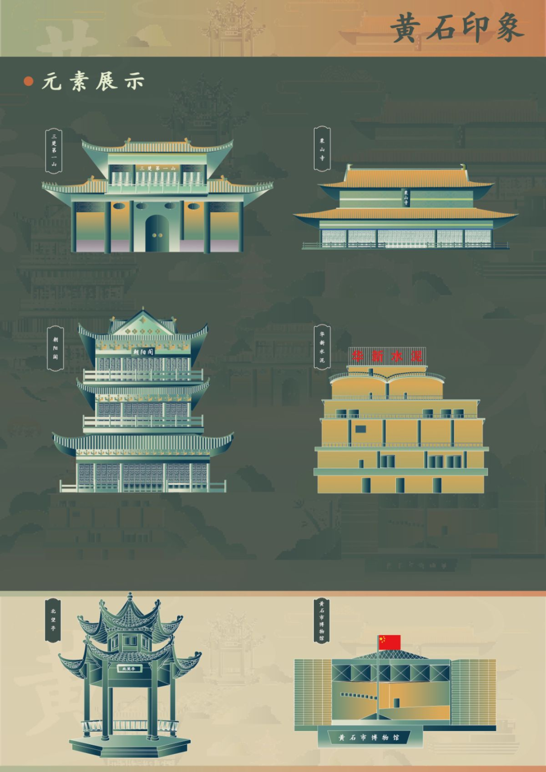 本作品(图一) 灵感来源于黄石的景区建筑与自然风景,将雷山、东方山、仙岛湖、磁湖等风景区与山水河流相搭配。