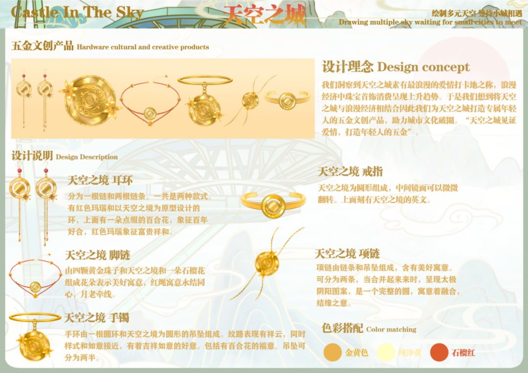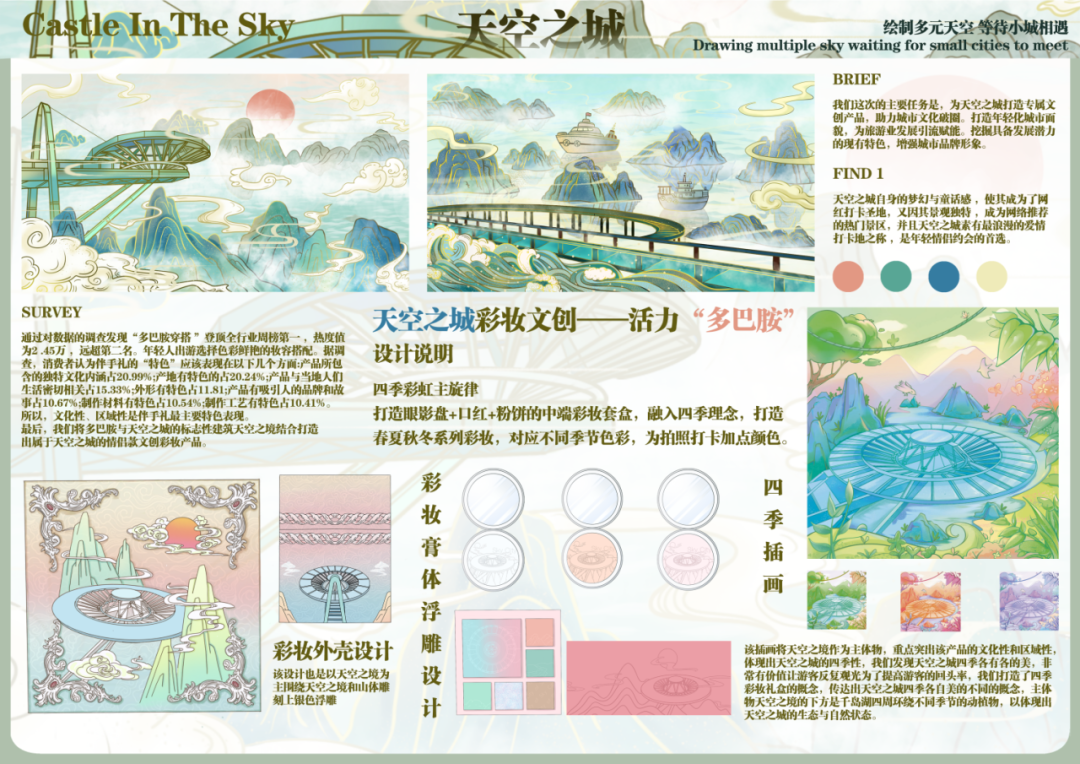将多巴胺与天空之城的标志性建筑天空之境结合打造出属于天空之城的情侣款彩妆文创产品,设计出了天空之城彩妆文创一-活力“多巴胺”,该产品以四季彩虹主旋律打造眼影盘+口红+粉饼的中端彩妆套盒,融入四季理念。