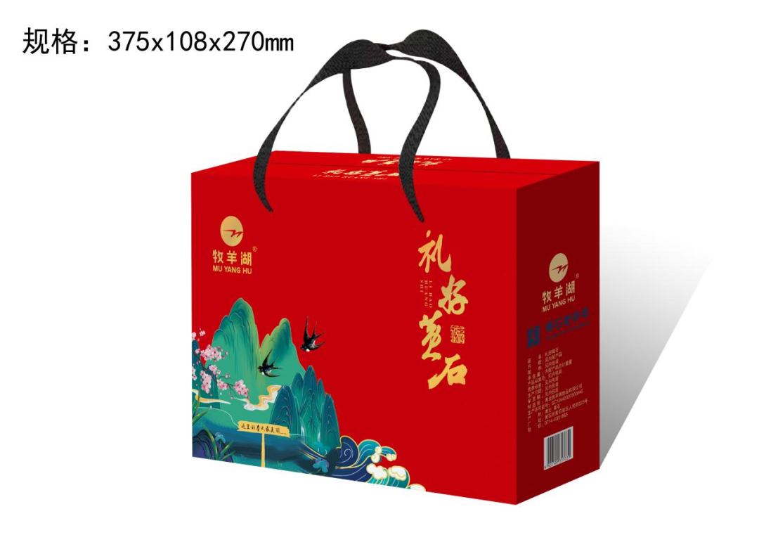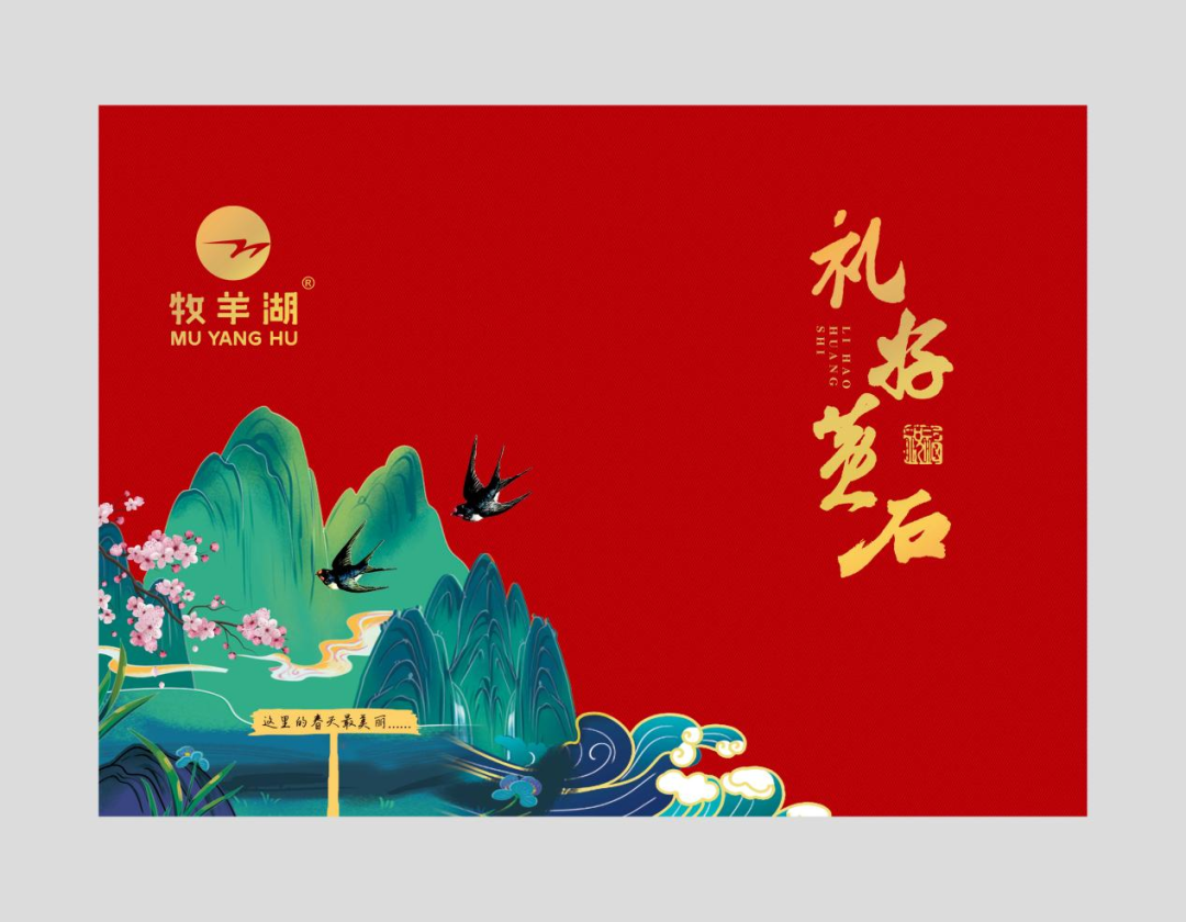 “礼好黄石”特产食品礼盒系长方体手拎盒,盒面主体颜色用大红色,画面山体颜色采用青绿色,画图选用《小燕子》歌谣中部分场景。“小燕子,穿花衣,年年春天来这里……”,这首少有人知,传唱大江南北的歌谣,唱的就是蓬勃发展的黄石。