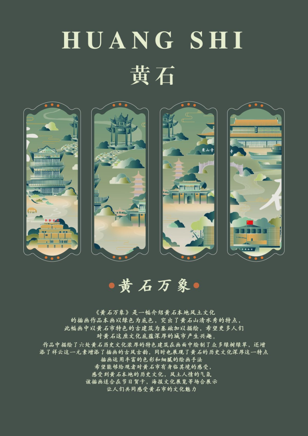 《黄石万象》是一幅介绍黄石本地风土文化的插画作品本画以绿色为底色,突出了黄石山清水秀的特点,此幅画中以黄石市特色的古建筑为基础加以描绘,希望更多人们对黄石这座文化底蕴深厚的城市产生兴趣。作品中描绘了六处黄石历史文化浓厚的特色建筑在画面中绘制了众多绿树绿草,还增添了祥云这一元素使插画具有古风古韵,同时也展现了黄石的历史文化深厚这一特点。插画运用丰富的色彩和细腻的绘画手法,希望能够给观者对黄石市有身临其境的感受,感受到黄石本地的历史文化,风土人情的气氛。该插画适合在节日贺卡,海报文化展览等场合展示,让人们共同感受黄石市的文化魅力。