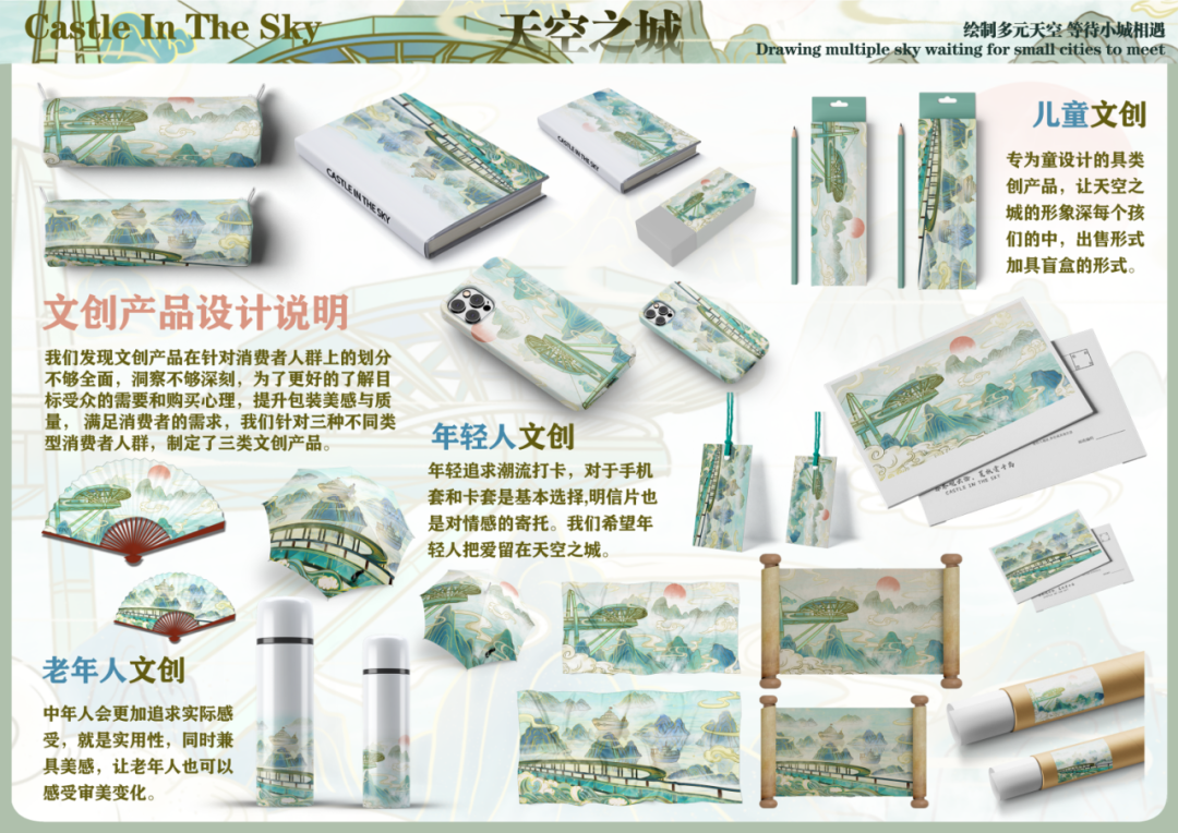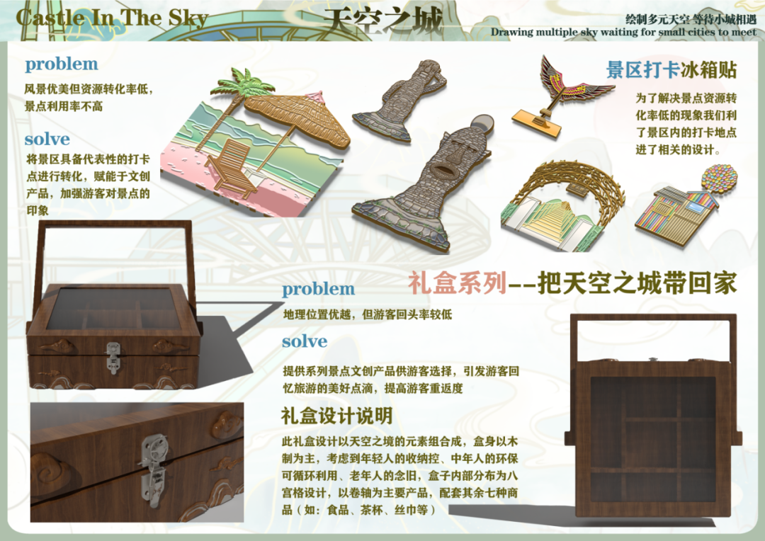 针对三种不同类型消费者人群,制定了三类文创产品。年轻追求潮流打卡,对于手机套和卡套是基本选择,明信片也是对情感的寄托,专为儿童设计的文具类文创产品,出售形式加具盲盒的形式。中年人会更加追求实际感受,为此我们也设计了一个木制礼盒,此礼盒设计以天空之境的元素组合成,盒身以木制为主,考虑到年轻人的收纳控、中年人的环保可循环利用、老年人的念旧,盒子内部分布为八宫格设计,以卷轴为主要产品,配套其余七种商品(如;食品、茶杯、丝巾等 ),作为载体,提供系列景点文创产品供游客选择,引发游客回忆旅游的美好点滴,提高游客重返。