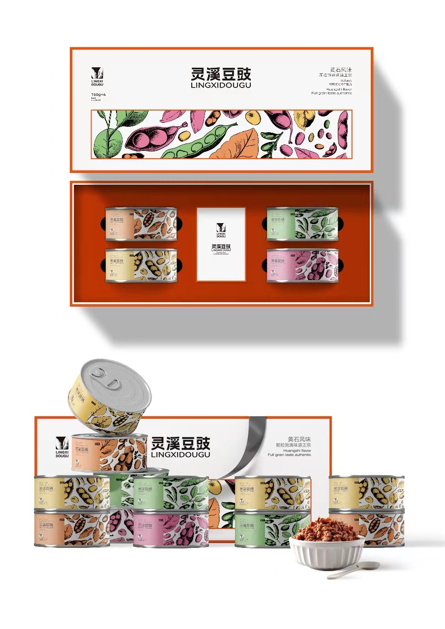 2、包装形式:采用马口铁易拉罐式包装,具有良好的密封性和便携性,能有效保持产品的新鲜度和品质。该包装与市场上其他灵溪豆豉的包装产生鲜明差异,彰显产品的独特性和与众不同之处。