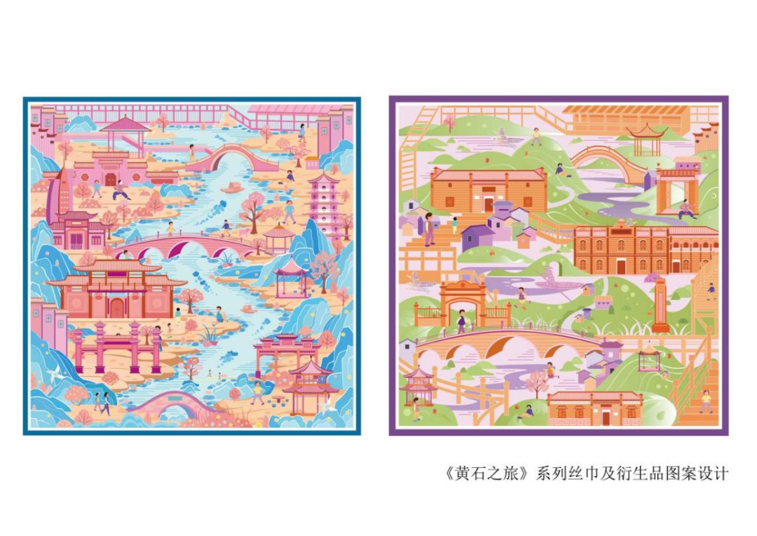 本作品(图二)灵感来源于黄石的红色景区与自然风景,将红三军团革命旧址龙港革命旧址、大冶兵暴旧址、鄂东南革命烈士陵园、下陆机修厂工人俱乐部、大箕铺镇曹家晚村革命旧址等景区与山水河流小桥亭子相搭配。