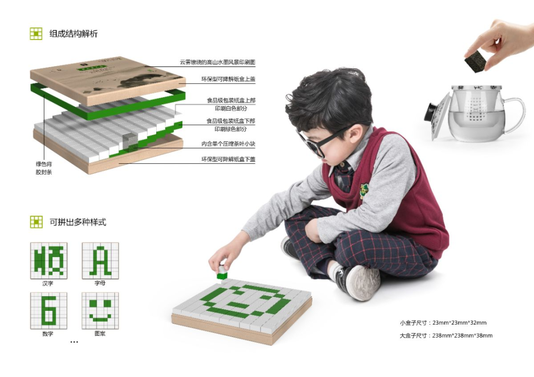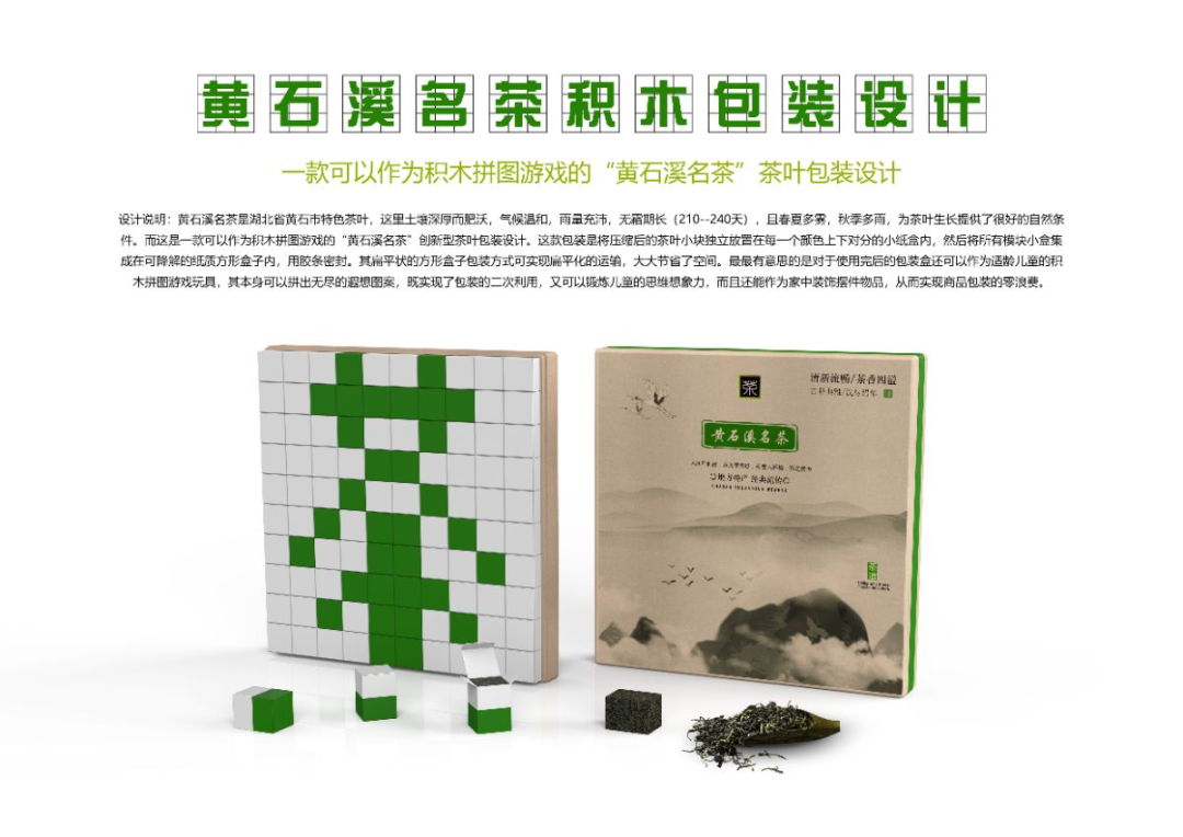 黄石溪名茶是湖北省黄石市特色茶叶,这里土深而肥沃,气候温和,雨量充沛,无霜期长210-240天),且春夏多雾,秋季多雨,为茶叶生长提供了很好的自然条件。而这是一款可以作为积木拼图游戏的“黄石溪名茶”创新型茶叶包装设计。这款包装是将压缩后的茶叶小块独立放置在每一个颜色上下对分的小纸盒内,然后将所有模块小盒集成在可降解的纸质方形盒子内,用胶条密封。其扁平状的方形盒子包装方式可实现扁平化的运输,大大节省了空间。最最有意思的是对于使用完后的包装盒还可以作为适龄儿童的积木拼图游戏玩家,其本身可以拼出无尽的遐想图案,既实现了包装的二次利用,又可以锻炼儿童的思维想象力,而还能作为家中装饰摆件物品,从而实现商品包装的零浪费。