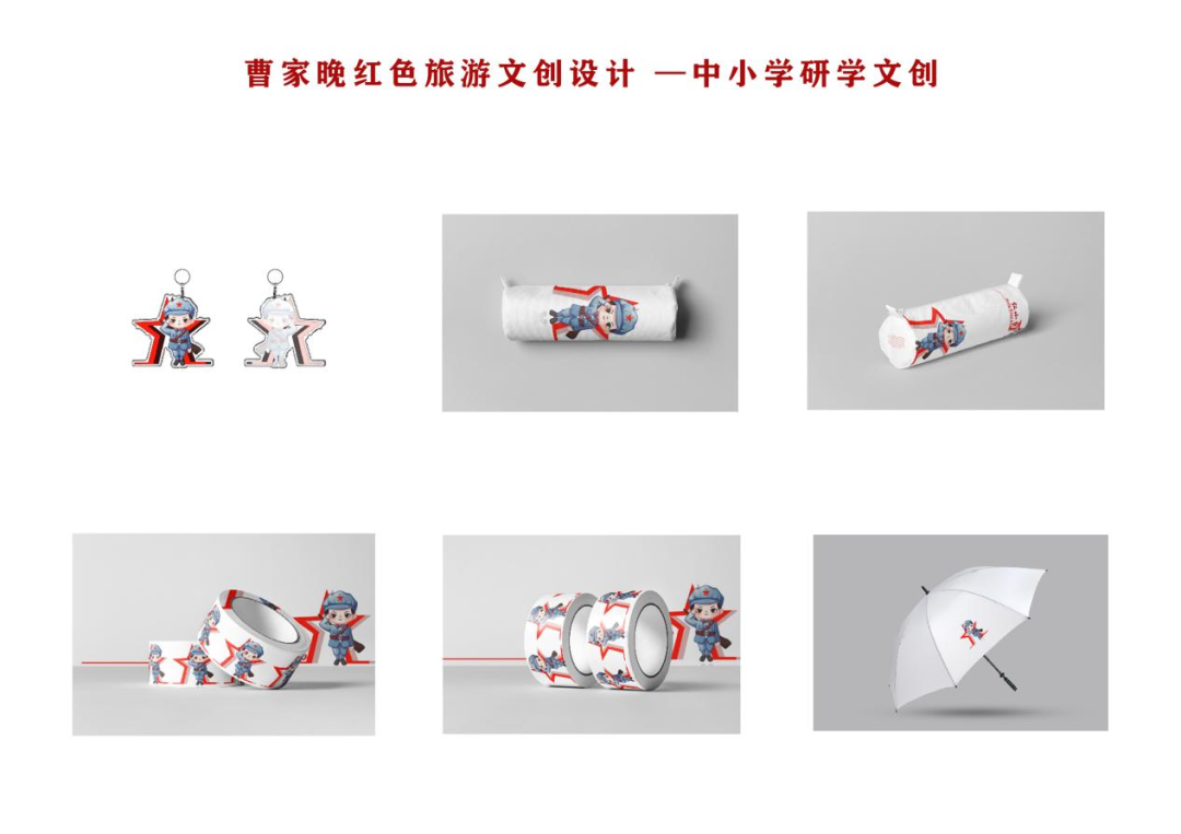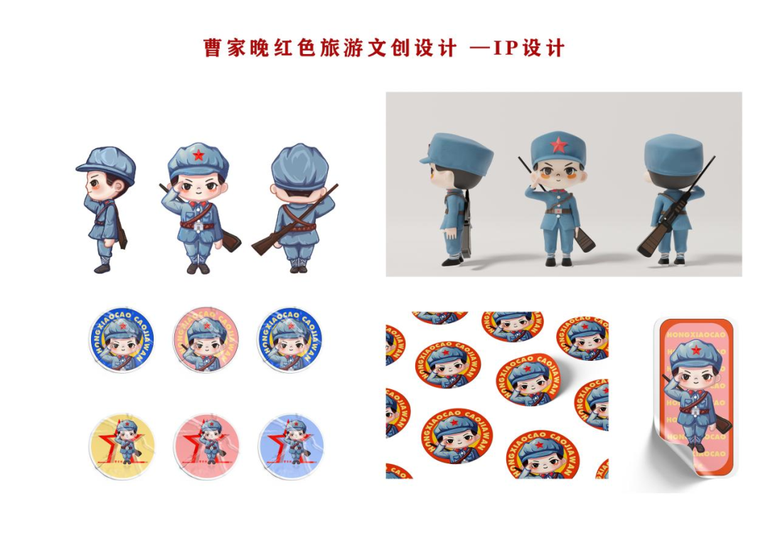 姓名:红小曹,家乡:曹家晚村;主要以曹亚伯形象,及曹家晚村的抗战英雄为设计灵感。腰带中间是由曹家湾鄂东南第一个农村党支部旧址为原型进行创作,体现当地特色文化。