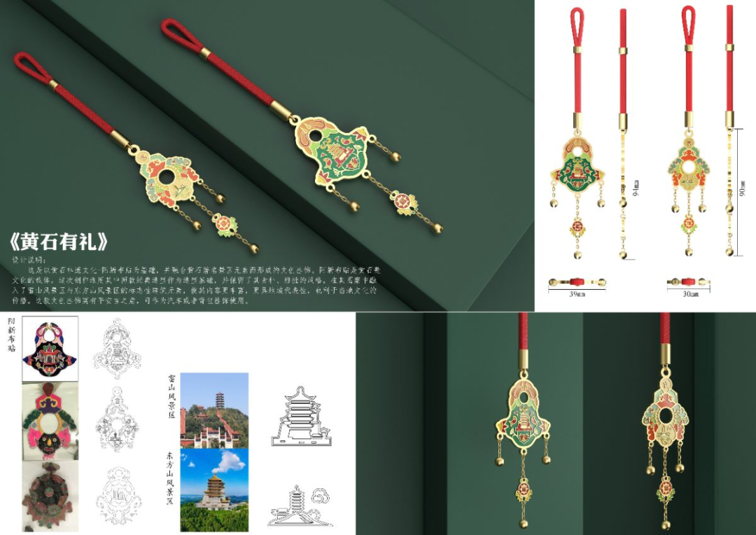 这是以黄石非遗文化—阳新布贴为基础,并融合黄石著名景区元素而形成的文创首饰。阳新布贴是黄石楚文化的载体,这次创作选择其中两款经典造型作为造型基础,并保留了其古朴、雅拙的风格。在图案中融入了雷山风景区与东方山风景区的标志性建筑元素,使其内容更丰富,更具地域代表性,也利于当地文化的传播。这款文化既有平安之意,可作为汽车或者背包挂饰使用。