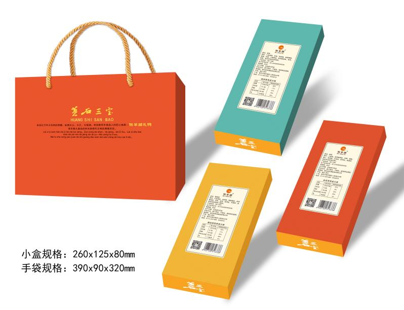 用道法自然“三生万物”作为设计思想,把特产食品组合成黄石三宝,通过黄石三宝把自然景观与美食文化进行融合,通过红黄蓝三色把三气进行结合,通过历史长河把数百年食品人的匠心独具同现代生活进行聚合,让更多的受众了解黄石历史人文。