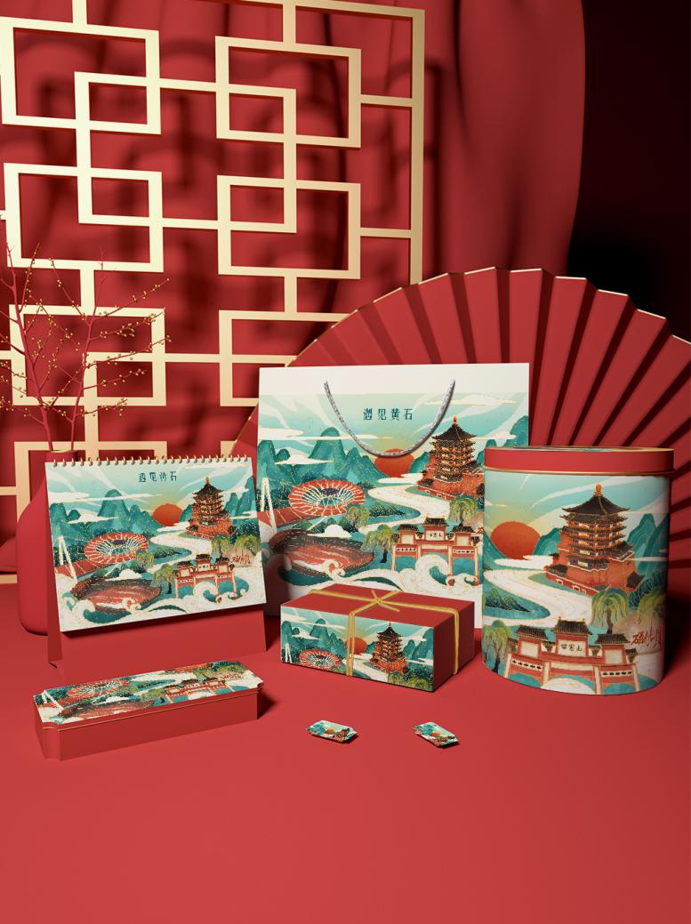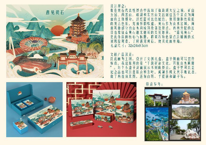 本次作品结合黄石的标志性建筑景点和家乡情怀,从黄石众多代表性景点中选取了仙岛湖天空之城、矿山公园、东方山文昌阁、磁湖和西塞山这五个景点,用怀旧复古色系绘制成插图用作礼盒封面。通过这张图使观者遇见黄石,了解黄石,走进黄石。装着纪念品的文创礼盒承载着黄石人的家乡情怀,也有着一定渲染力,满足了交流馈赠礼品的需求,将黄石的美丽景色宣传出去。