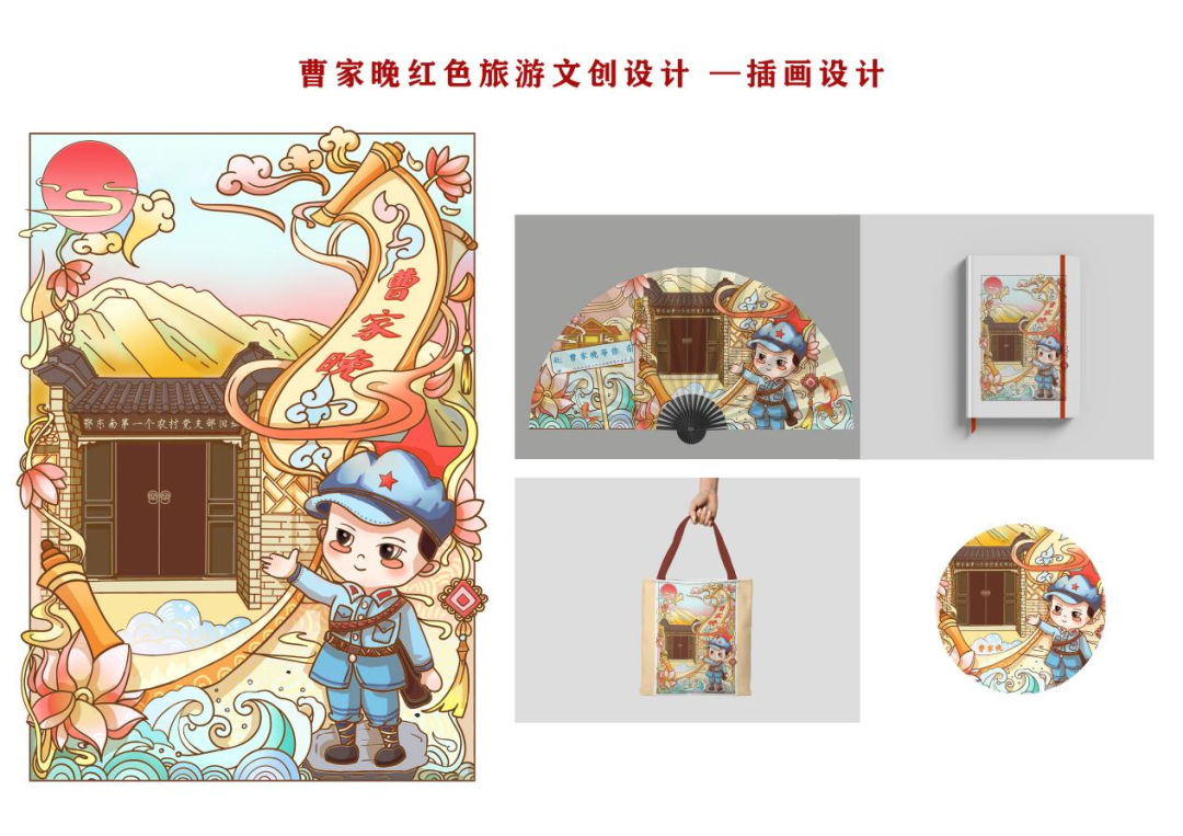 以曹家晚著名地标建筑“鄂东南第一个农村党支部旧址”为主体物与红小曹IP进行互动的插画设计,画面整体采用红色系,IP红小曹站在前方向大众介绍推广鄂东南第一个农村党支部旧址,后方以书卷、祥云、莲花、青绿山峰、红日等象征红色爱国情感和祖国大好河山的元素填充画面,下方以海浪元素进行氛围烘托,整体效果和谐统一。