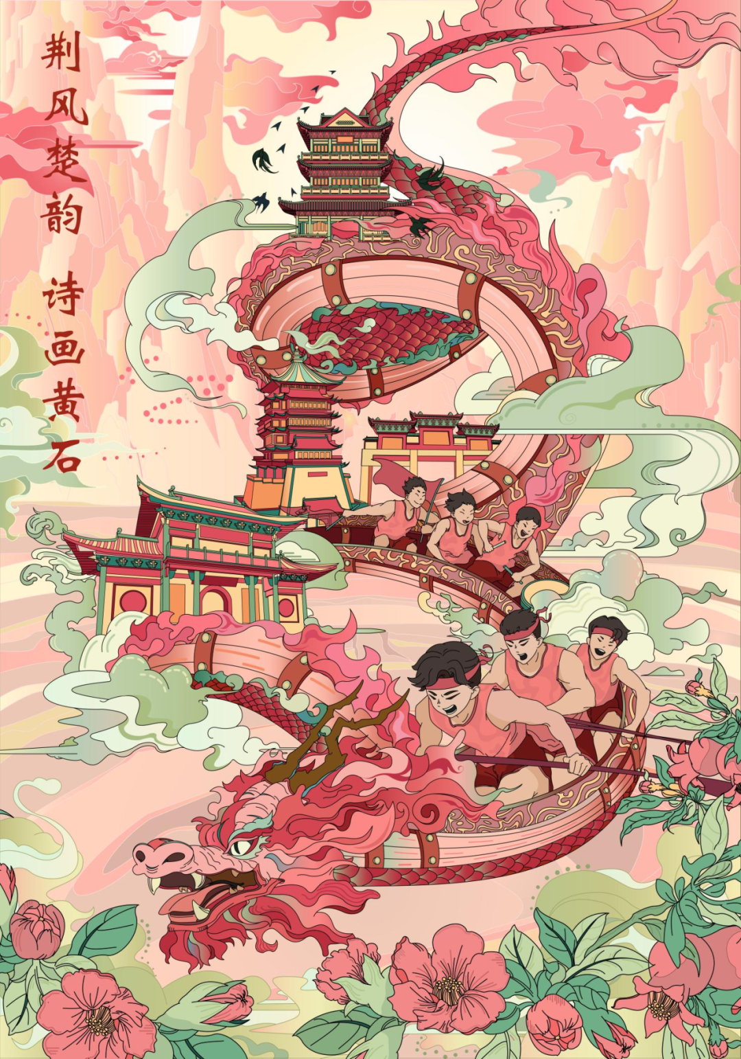 海报设计灵感来源于将湖北黄石文化的丰富内涵,融入到视觉设计中。通过对矿质大峡谷、东昌阁、西塞山、朝阳阁等建筑性标志和景点的元素提取,与黄石特色民俗传统节日端午节西塞神州会相结合,进行创意设计和表现。画面的前景则是以黄石的市花石榴花进行点缀,穿插设计展现出黄石文化的独特魅力。呈现出富有时代感和创新性的视觉效果,以达到传扬和推广湖北黄石文化的作用。西塞神舟会作为黄石的传统节日,其蕴含着拼搏进取,积极向上的民族精神,传承着团结一致,奋勇向前的民族基因,这艘承载着黄石民族力量的龙舟,也将带着黄石划向美好未来。