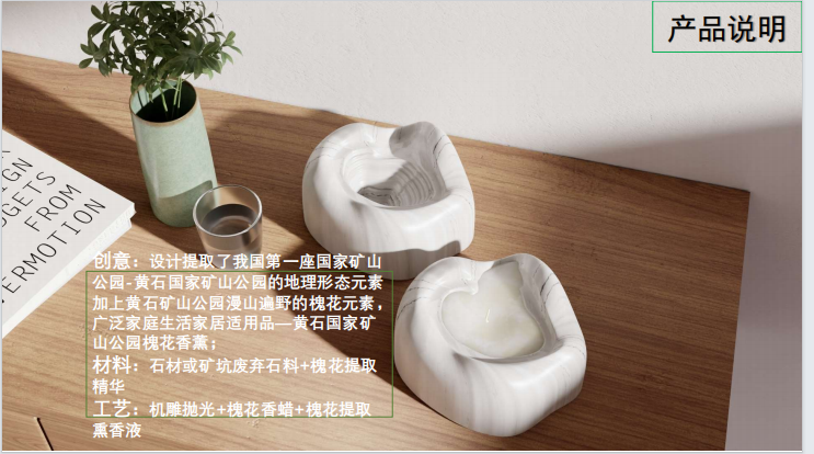 设计提取了我国第一座国家矿山公园-黄石国家矿山公园的地理形态元素加上黄石矿山公园漫山遍野的槐花元素,制作家居适用品—黄石国家矿山公园槐花香薰。