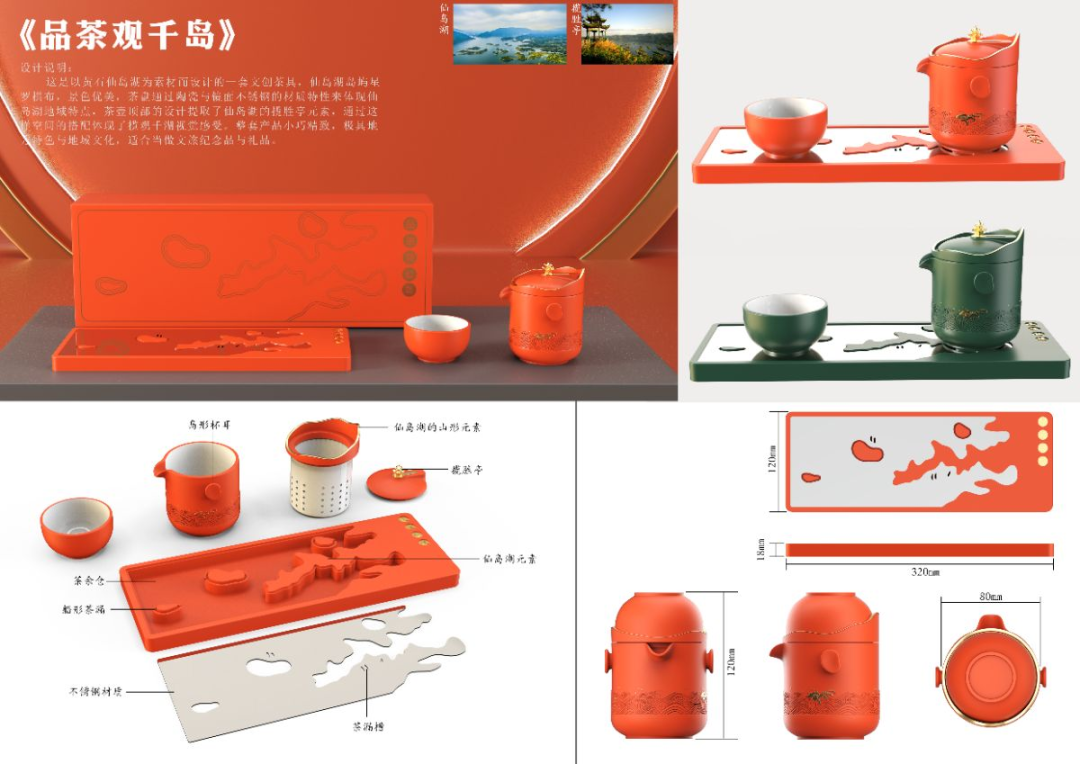 这是以黄石仙岛湖为素材而设计的一套文创茶具,仙岛湖岛屿星罗棋布,景色优美。茶具通过陶瓷、黄铜与不锈钢的材质特性来体现仙岛湖地域特点,茶壶顶部的设计提取了仙岛湖的揽胜亭元素,通过这样空间的搭配体现了揽观千湖视觉感受。整套产品小巧精致,极其地具有特色与地域文化,适合当作文旅纪念品与礼品。