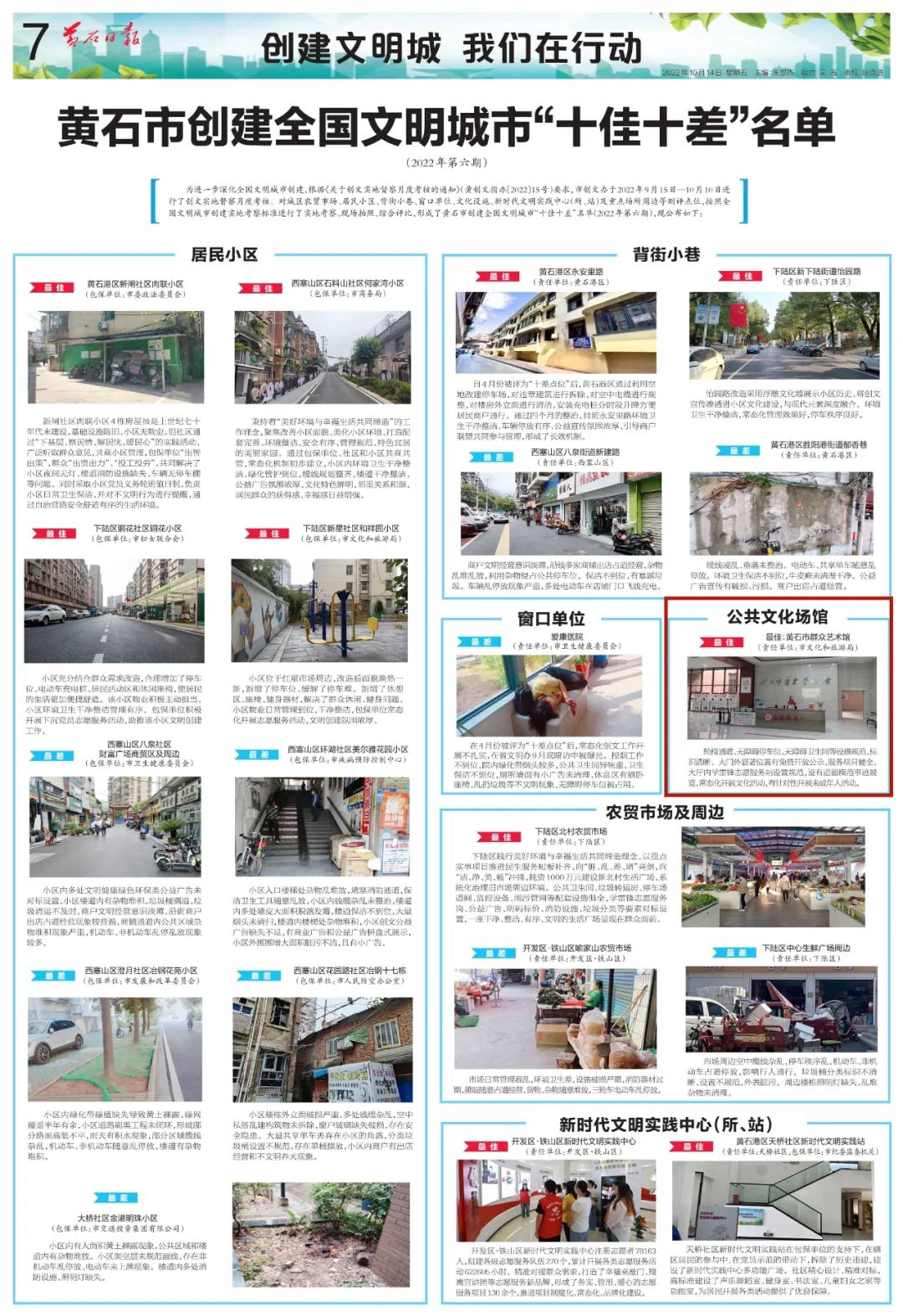 为进一步深化全国文明城市创建,根据《关于创文实地督察月度考核的通知》(黄创文指办〔2022〕15号)要求,市创文办于2022年9月15日—10月10日进行了创文实地督察月度考核。对城区农贸市场、居民小区、背街小巷、窗口单位、文化设施、新时代文明实践中心(所、站)及重点场所周边等测评点位,按照全国文明城市创建实地考察标准进行了实地考察、现场拍照、综合评比,形成了黄石市创建全国文明城市“十佳十差”名单(2022年第六期)。其中,黄石市群众艺术馆被评为“公共文化场馆”类最佳。