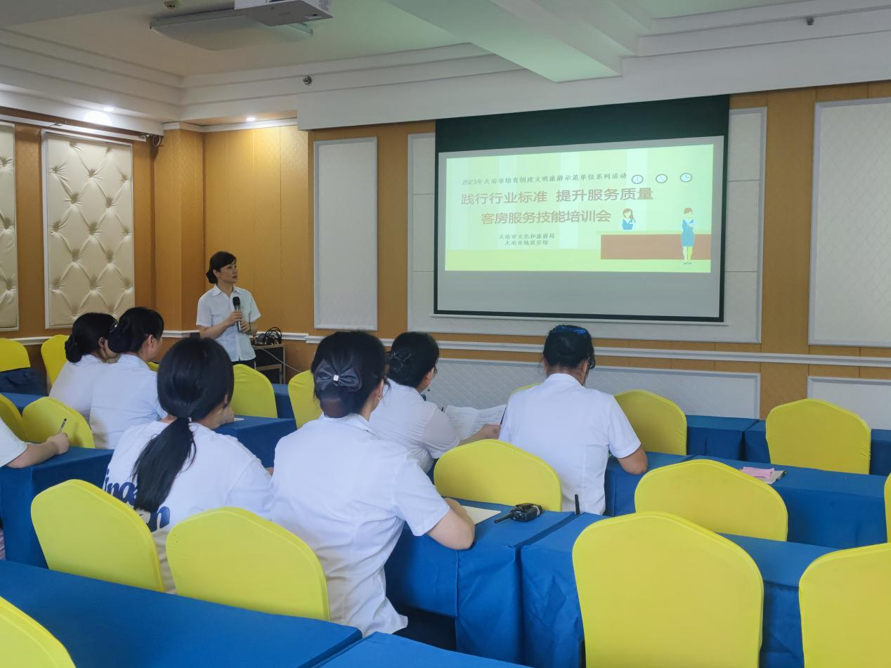 为进一步践行旅游饭店行业标准,提升从业人员的服务标准,培育创建文明旅游示范单位,7月21日,大冶市文化和旅游局组织地质宾馆业务骨干人员开展创建文明旅游示范单位培训。