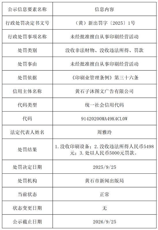 (黄)新出罚字〔2025〕1号