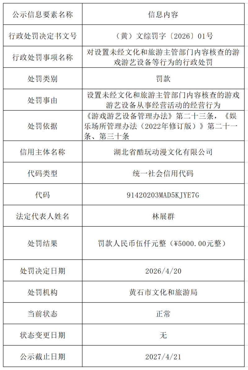(黄)文综罚字〔2026〕01号